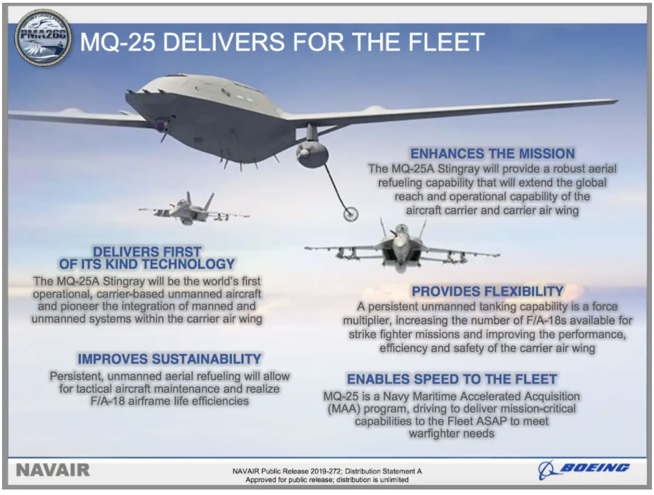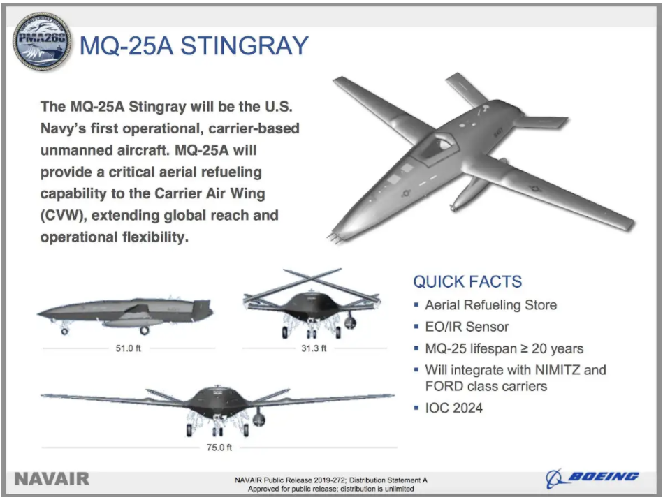 Το πολεμικό Ναυτικό των Η.Π.Α. ενεργοποίησε επίσημα την πρώτη μοίρα που θα χρησιμοποιεί στο εγγύς μέλλον τα μη επανδρωμένα ιπτάμενα τάνκερ MQ-25 Stingray της Boeing. Οι δοκιμές στον αέρα δεν αναμένονται να ξεκινήσουν πριν από το τέλος του επόμενου έτους. Ως εκ τούτου, η μονάδα θα επικεντρωθεί εν τω μεταξύ στην εκπαίδευση του προσωπικού της ώστε να είναι έτοιμη να χειριστεί και να συντηρεί αυτά τα αεροσκάφη όταν αρχίσουν να φθάνουν τα επόμενα χρόνια.