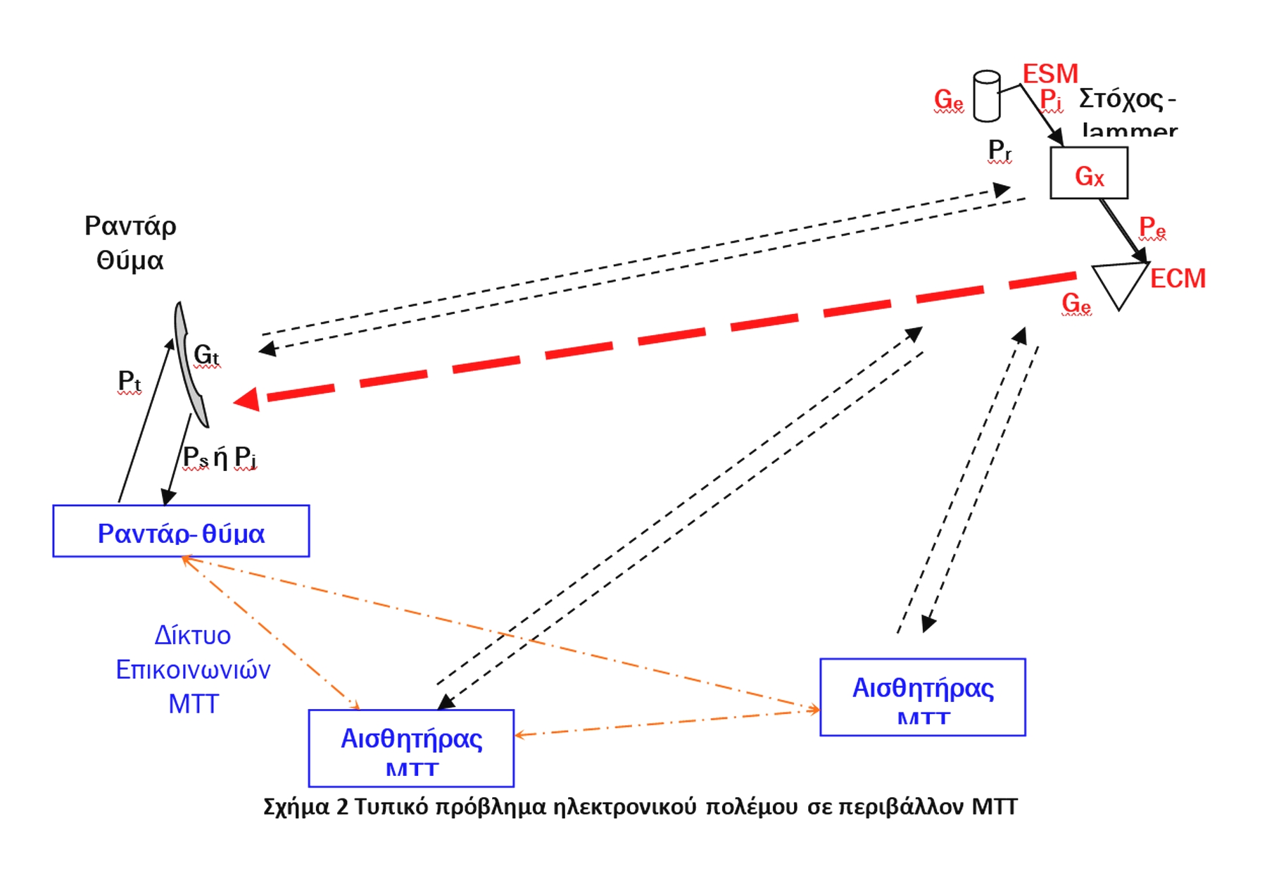Στο παρακάτω Σχήμα 2 παρουσιάζεται ένα ενδεικτικό τυπικό πρόβλημα του ηλεκτρονικού πολέμου με ένα ραντάρ θύμα σε φίλιο περιβάλλον ΜΤΤ και ένα εχθρικό στόχο με δυνατότητες ηλεκτρονικών υποκλοπών ESM και ηλεκτρονικών αντιμέτρων ECM: