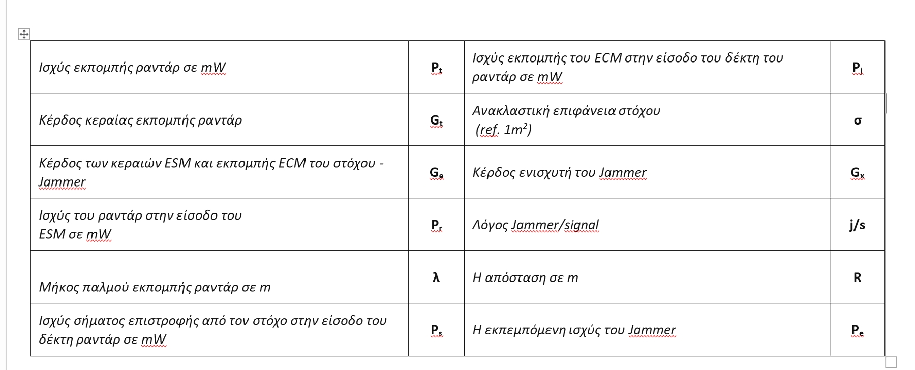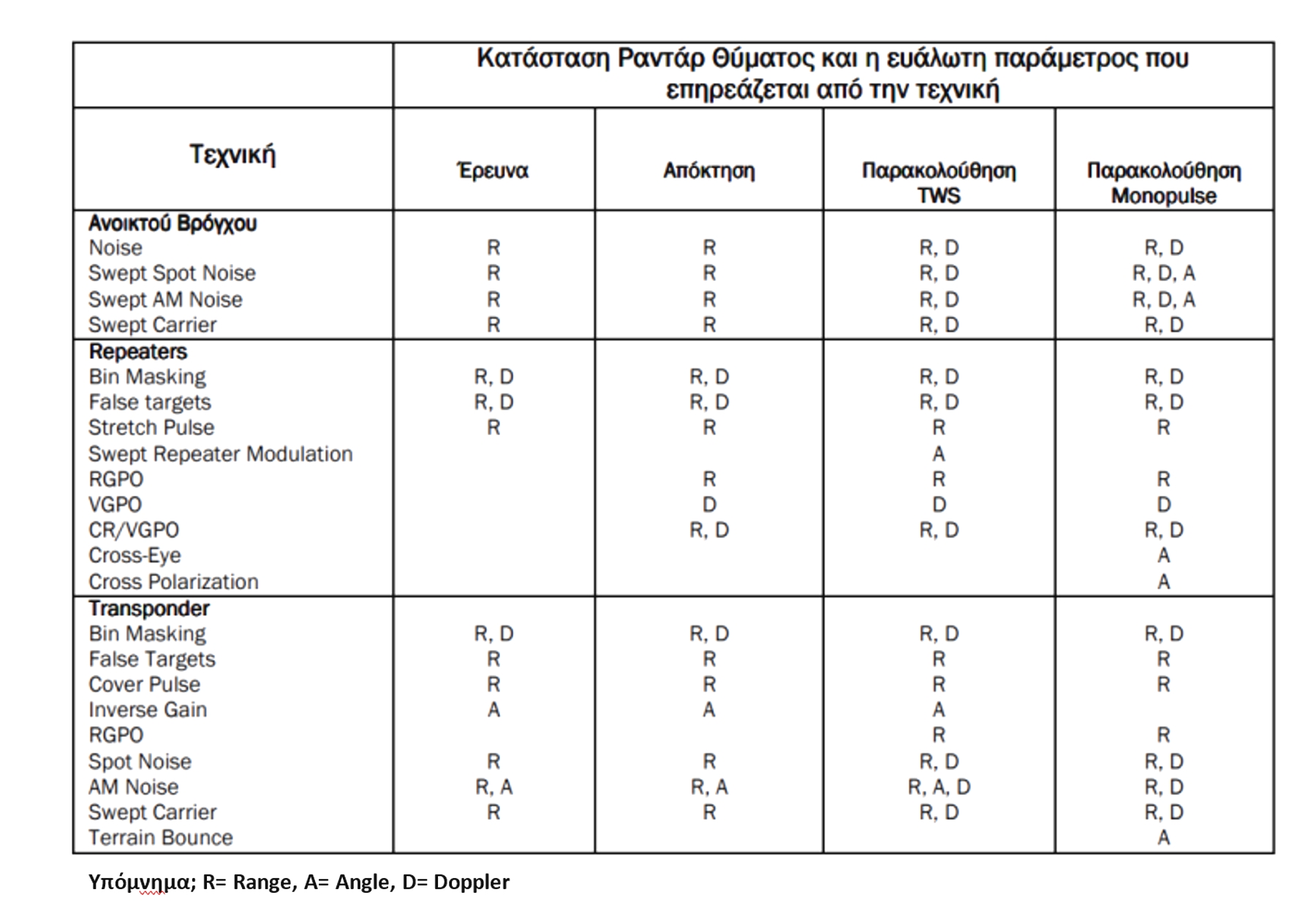Σημειώνεται ότι παρόµοιοι Πίνακες υπάρχουν στα περισσότερα βιβλία που ασχολούνται µε τον Ηλεκτρονικό Πόλεµο. Αντίστοιχα τα υποψήφια ραντάρ θύματα πρέπει να διαθέτουν τεχνικές αντιμέτρων ECCM οι οποίες να εξουδετερώνουν ή να τουλάχιστον να περιορίζουν την αποτελεσματικότητα των παρεμβολών.