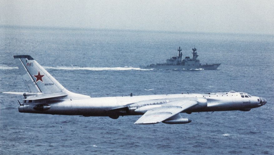 Πρέπει να σημειωθεί εδώ ότι η σοβιετική ναυτική ισχύς στον αντιπλοϊκό τομέα συμπληρώνεται διαχρονικά από εξαιρετικά πολυάριθμη και ισχυρή ναυτική αεροπορία (AV-MF), η οποία συγκροτείται από υποστρατηγικά αεροσκάφη, τα οποία αυτονόητα επιχειρούν από βάσεις ξηράς. Διαχρονικός αστέρας το τετρακινητήριο στροβιλοελικοφόρο Tupolev Tu-95 “Bear-D”, το οποίο είναι έκδοση ναυτικής συνεργασίας του αειθαλούς στρατηγικού βομβαρδιστικού της Στρατηγικής Αεροπορίας της ΕΣΣΔ (DA), επιφορτισμένη με τις αποστολές της ναυτικής αναγνώρισης με ραντάρ μεγάλης εμβελείας και της παροχής δεδομένων στοχοποίησης σε σκάφη επιφανείας και υποβρύχια της ΕΣΣΔ. Που προφανώς – για λόγους ορίζοντος και εμβέλειας ραντάρ – αδυνατούν να τροφοδοτήσουν με δεδομένα των δικών τους αισθητήρων τους μεγάλου βεληνεκούς αντιπλοϊκούς πυραύλους που φέρουν.