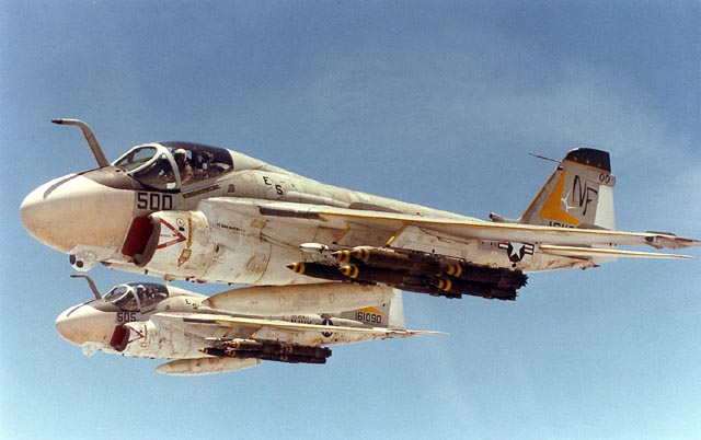 Intruder όμως υπήρχαν μόνο 10 (μία μοίρα μέσου βομβαρδισμού με 10 A-6E TRAM & 4 άοπλα τάνκερ KA-6D) σε αεροπλανοφόρο με τυπική σύνθεση πτέρυγας. Και αυτά τα 10 επωμίζονταν, πέραν του αντιπλοϊκού αγώνα με Harpoon, και αποστολές κρούσεως ακριβείας με Paveway, αεροναρκοθέτησης, καταστολής αεράμυνας (“Iron Hand”) με AGM-78 Standard ARM (ως Α-6Β & Α-6Ε PAT/ARM) και αργότερα AGM-88 HARM,κρούσεως νύχτα ή με καιρό (μόνα όπλα οι βόμβες ελευθέρας πτώσεως στον καιρό) κλπ. Βαριά καθήκοντα για μόλις 10 αεροσκάφη, σχετικώς μικρής διαθεσιμότητας λόγω τεχνικής πολυπλοκότητας …