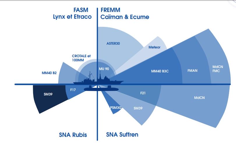 Στο γράφημα παρουσιάζονται τα βελτιωμένα όπλα που θα φέρουν μελλοντικά η φρεγάτα FREMM και το υποβρύχιο Suffren, σε σύγκριση με τις πλατφόρμες που αντικαθιστούν. Στο γράφημα, λοιπόν, η FREMM εμφανίζεται να εξοπλίζεται με τη βελτιωμένη έκδοση του Exocet MM40 Block 3c και τον… Meteor!