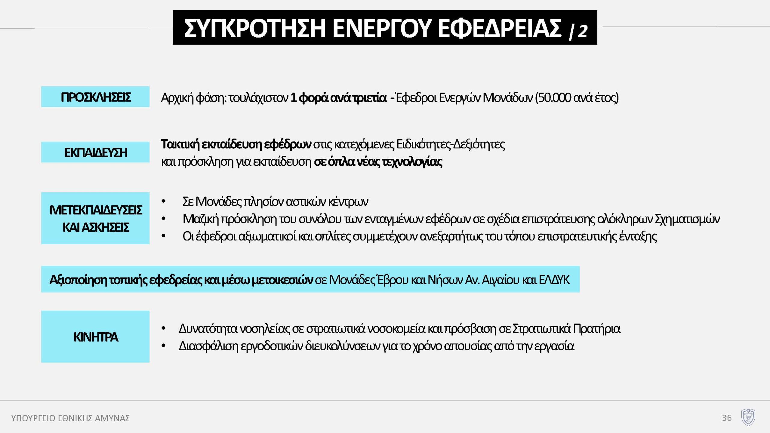 Ως προς την υπόλοιπη Ενεργό Εφεδρεία, ξεκινάμε στην αρχική φάση, πρόσκληση ανά τριετία -είναι μεγάλο το χρονικό διάστημα- αλλά σε πρώτη φάση θα πάμε σε 50.000 το χρόνο. Θα τους εκπαιδεύουμε στις κατεχόμενες ειδικότητες και δεξιότητες και στα όπλα νέας τεχνολογίας -μίλησα πριν για τα drones και αντι-drones – σε ειδικές μονάδες και θα αξιοποιήσουμε την τοπική Εφεδρεία στον Έβρο και στα νησιά του Ανατολικού Αιγαίου. Θα δώσουμε κίνητρα και θα δίνει τη δυνατότητα νοσηλείας στα Στρατιωτικά Νοσοκομεία, τη πρόσβαση στα Στρατιωτικά πρατήρια.