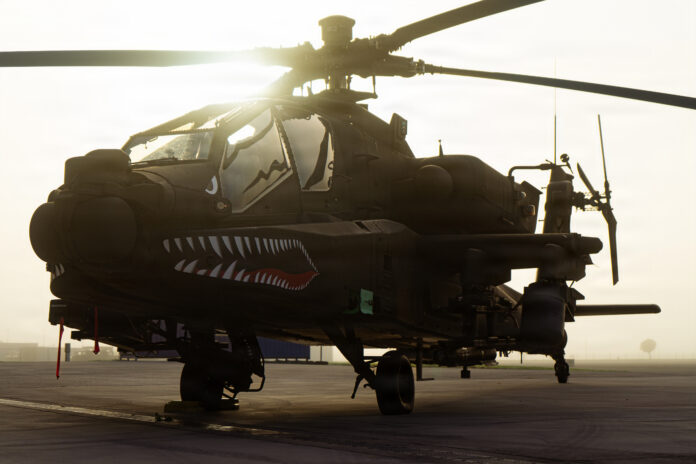 An AH-64E Apache Guardian helicopter is staged for the ceremony re-flagging 1-3 Attack Battalion to 2-159th Attack Battalion. The 12th Combat Aviation Brigade has reflagged its attack battalion from 1st Battalion, 3rd Aviation Regiment (Attack) to 2nd Battalion, 159th Aviation Regiment (Attack). The activation of the “Gunslingers” Battalion is largely a change in name-only for 12th CAB, part of the wider Army Aviation Transformation Initiative (AATI). This action returns the 1-3 Attack Battalion lineage to the 3rd Combat Aviation Brigade at Fort Stewart, Georgia, while re-activating a historic unit name for the U.S. Army’s attack presence in Europe. The 2-159th Attack Battalion will continue to provide USAREUR-AF with a ready and lethal force, postured to deter, and, if necessary, defeat aggression across the theater of operations.