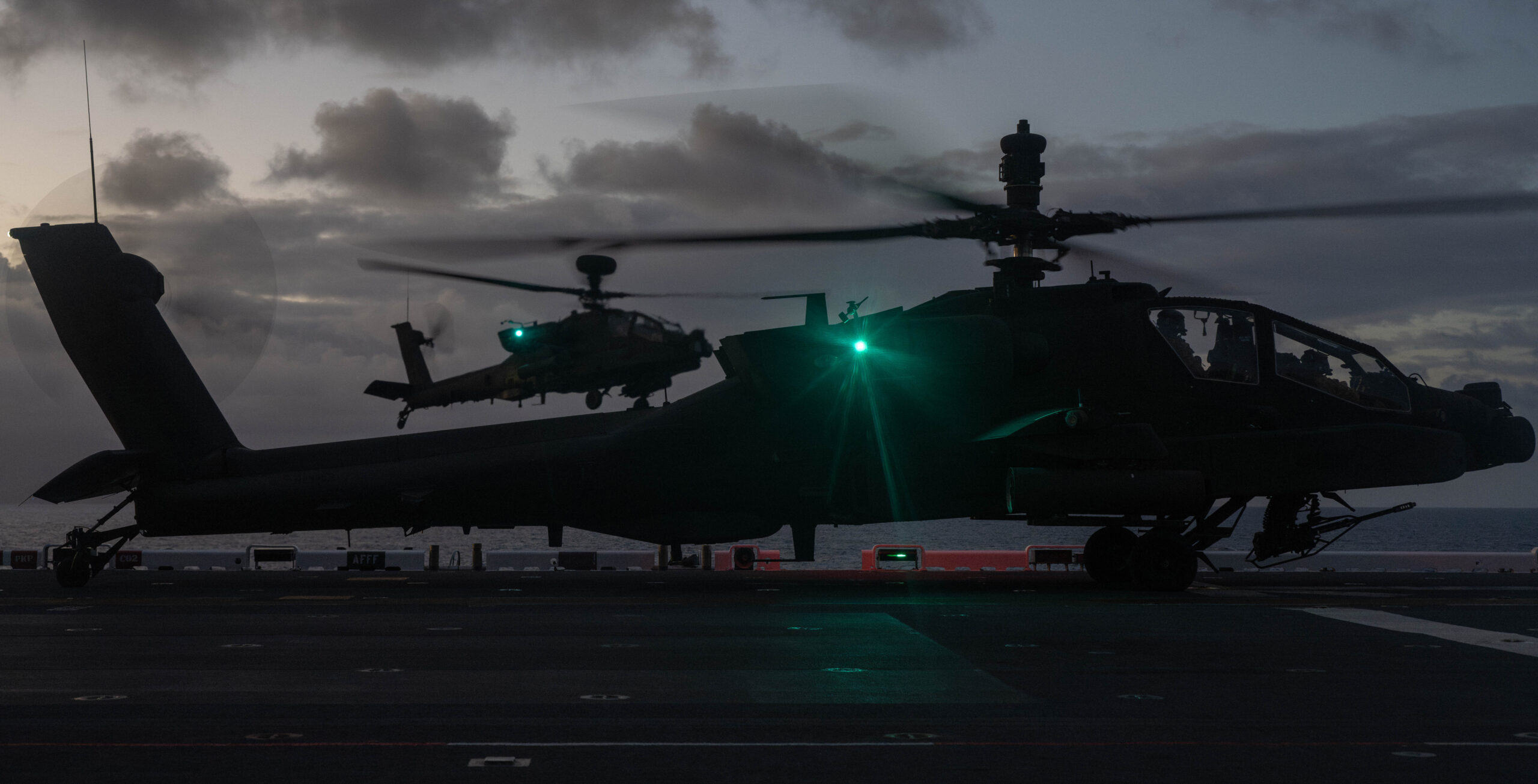 250911-N-TW227-1081 PACIFIC OCEAN (Sept. 11, 2025) Two U.S. Army AH-64E Apache Guardian helicopters from the 2nd Squadron, 6th Calvary Regiment both assigned to the 25th CAB land on the flight deck of the amphibious assault ship USS America (LHA 6) during a joint aviation training exercise with the U.S. Army, boosting interoperability and readiness in the Indo-Pacific region Sept. 11. America is operating in the U.S. 3rd Fleet area of operations. An integral part of the U.S. Pacific Fleet, U.S. 3rd Fleet leads naval forces in the Indo-Pacific and provides the realistic, relevant training necessary to execute the U.S. Navy’s role across the full spectrum of military operations. U.S. 3rd Fleet works together with allies and partners to advance freedom of navigation and overflight, the rule of law and other principles that underpin security for the Indo-Pacific region. (U.S. Navy photo by Mass Communication Specialist 3rd Class Kenneth Melseth)