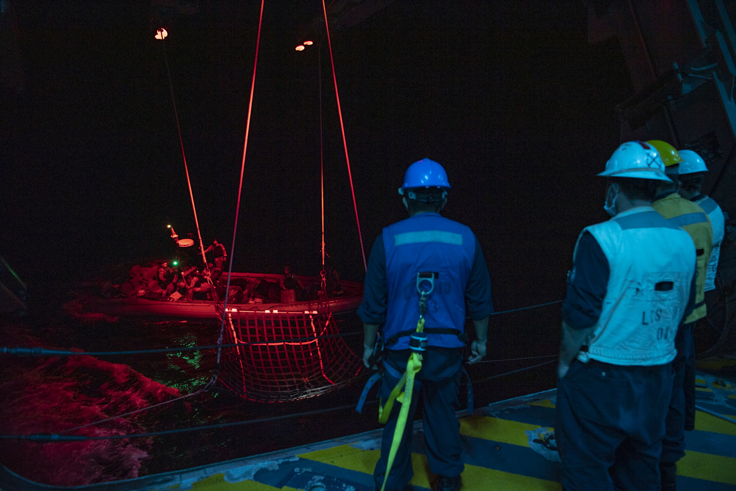 PACIFIC OCEAN (Dec. 5, 2020) – The crew of Independence-variant littoral combat ship USS Gabrielle Giffords (LCS 10) and embarked U.S. Coast Guard Law Enforcement Detachment (LEDET) 407 transfer suspected contraband, Dec. 5, 2020. Gabrielle Giffords is deployed to the U.S. 4th Fleet area of operations to support Joint Interagency Task Force South’s mission, which includes counter illicit drug trafficking in the Caribbean and Eastern Pacific. (U.S. Navy photo by Mass Communication Specialist 2nd Class Allen Michael Amani/Released)