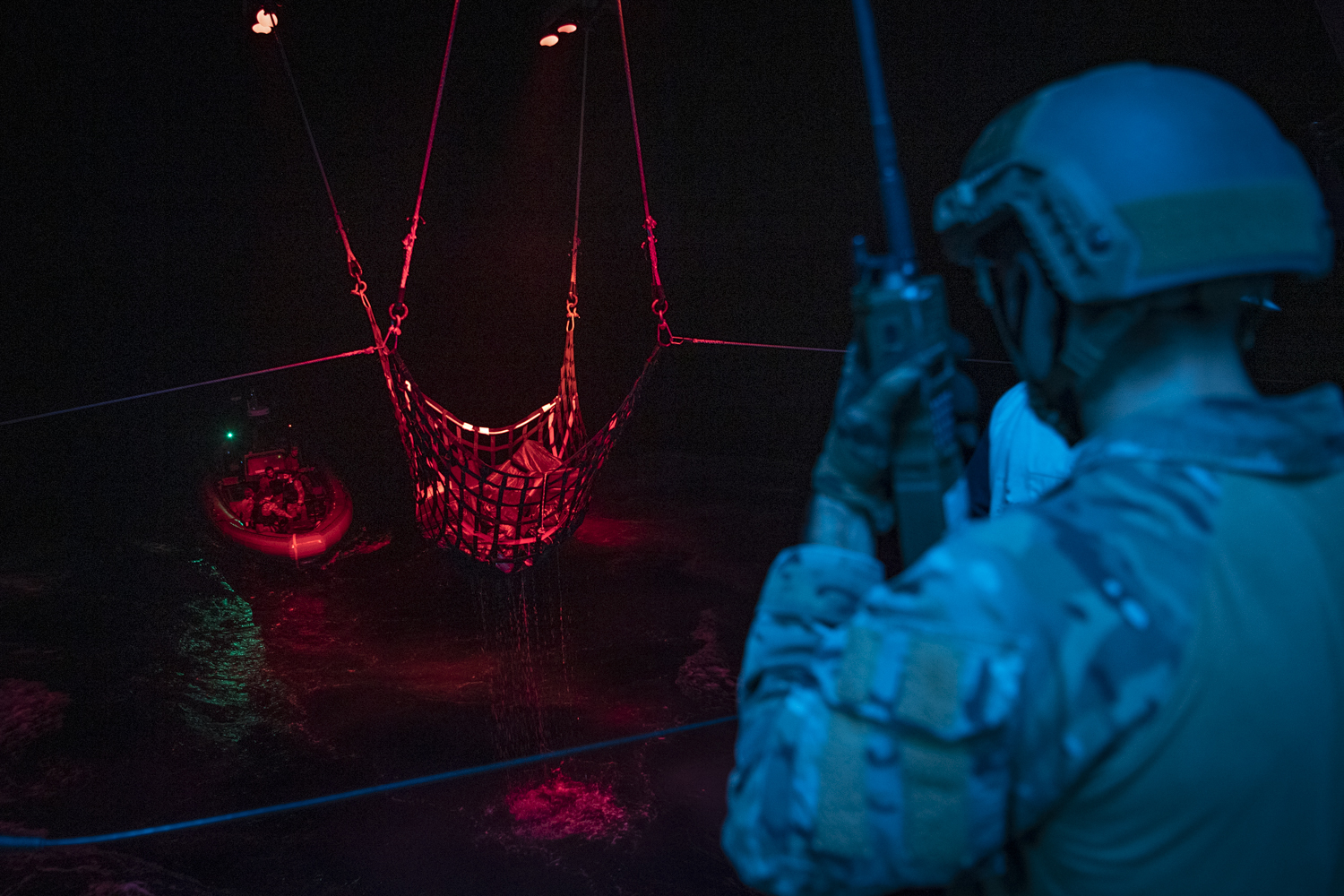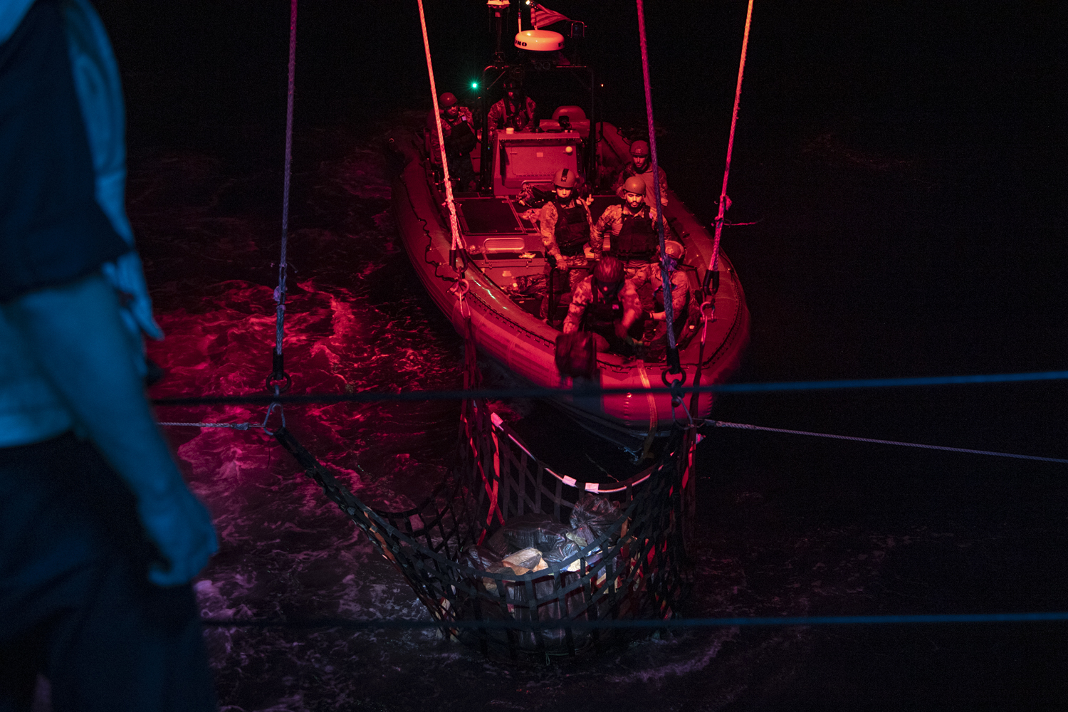 PACIFIC OCEAN (Dec. 5, 2020) – The crew of Independence-variant littoral combat ship USS Gabrielle Giffords (LCS 10) and embarked U.S. Coast Guard Law Enforcement Detachment (LEDET) 407 transfer suspected contraband while conducting enhanced counter-narcotics operations, Dec. 5, 2020. Gabrielle Giffords is deployed to the U.S. 4th Fleet area of operations to support Joint Interagency Task Force South’s mission, which includes counter illicit drug trafficking in the Caribbean and Eastern Pacific. (U.S. Navy photo by Mass Communication Specialist 2nd Class Allen Michael Amani/Released)