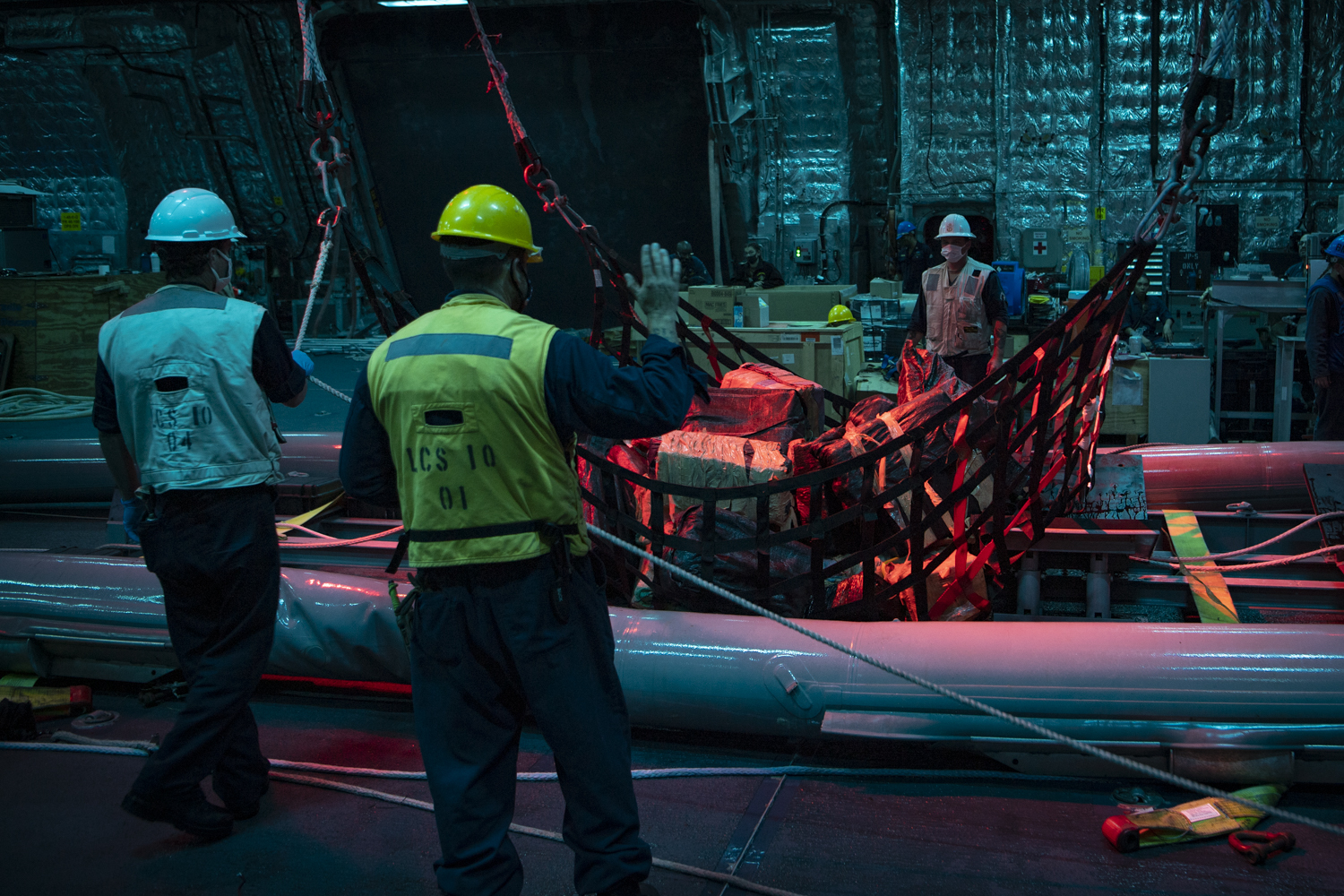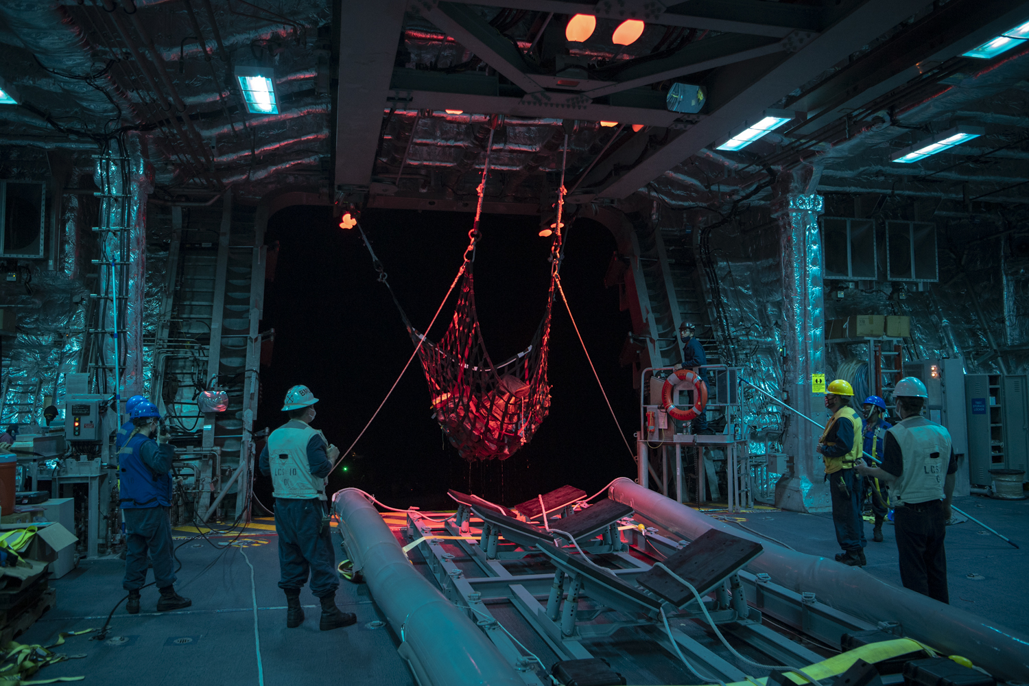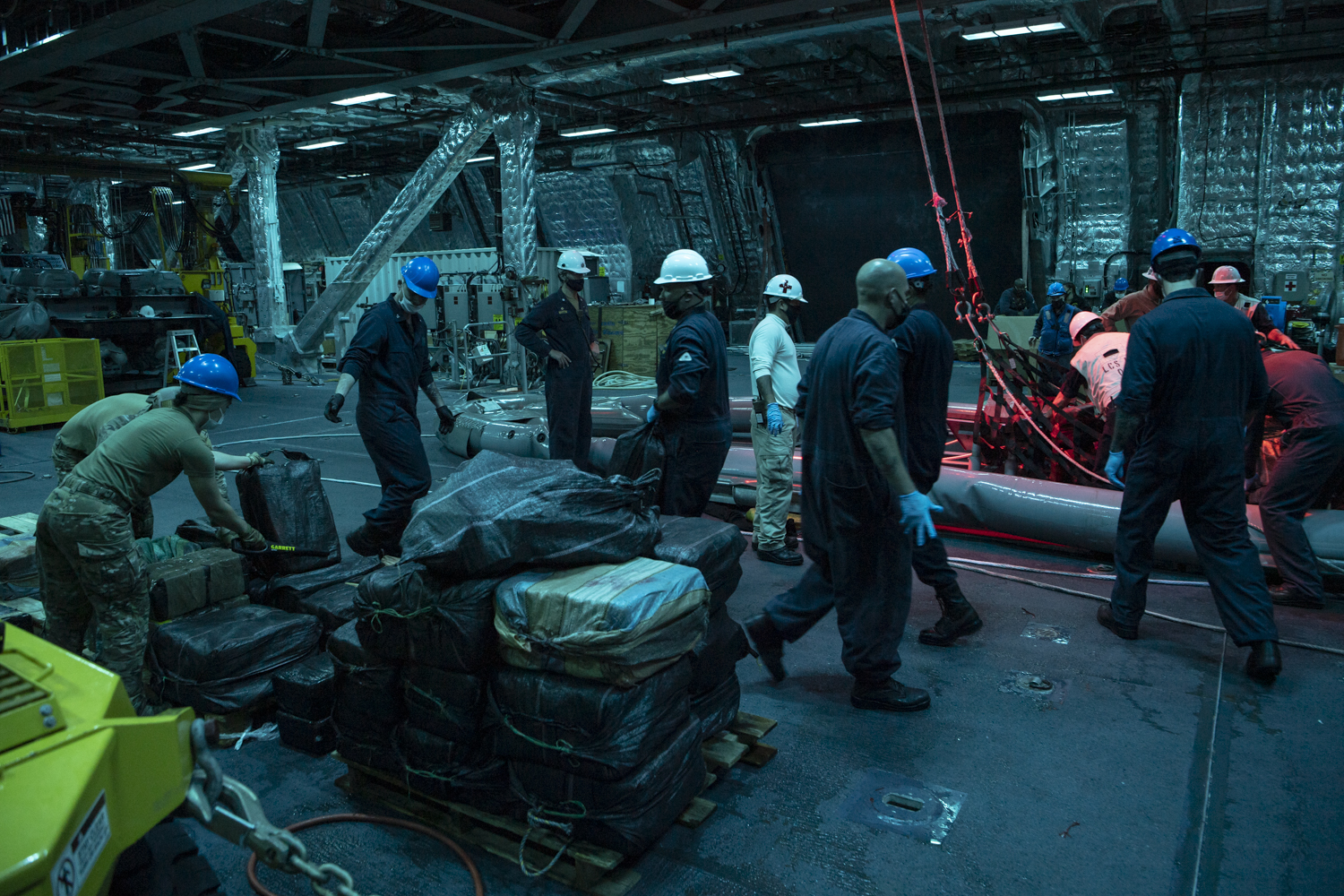 PACIFIC OCEAN (Dec. 5, 2020) – The crew of Independence-variant littoral combat ship USS Gabrielle Giffords (LCS 10) and embarked U.S. Coast Guard Law Enforcement Detachment (LEDET) 407 offload suspected contraband while conducting enhanced counter-narcotics operations, Dec. 5, 2020. Gabrielle Giffords is deployed to the U.S. 4th Fleet area of operations to support Joint Interagency Task Force South’s mission, which includes counter illicit drug trafficking in the Caribbean and Eastern Pacific. (U.S. Navy photo by Mass Communication Specialist 2nd Class Allen Michael Amani/Released)