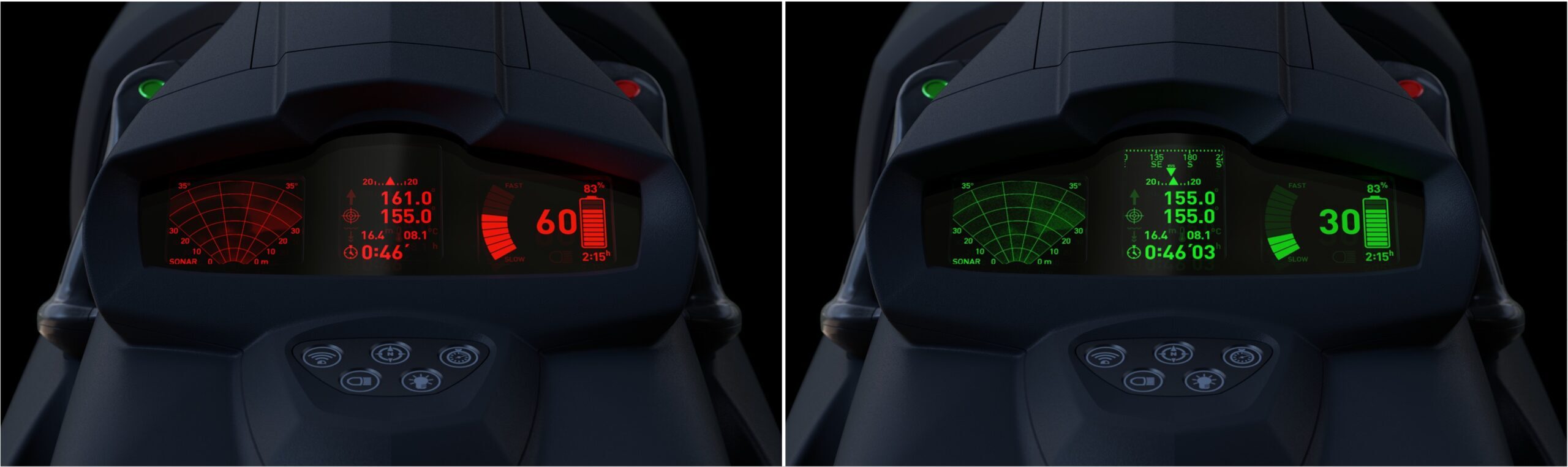 Το σύστημα συνοδεύεται από ψηφιακή πυξίδα, αισθητήρα βάθους, σύστημα πλοήγησης με ένδειξη πορείας και στόχου, καθώς και οθόνη TFT που προβάλλει κρίσιμα δεδομένα όπως ισχύ, υπολειπόμενη ενέργεια, βάθος, θερμοκρασία νερού και χρόνο αποστολής. Προαιρετικά, μπορούν να ενεργοποιηθούν ισχυροί προβολείς LED τριών επιπέδων φωτεινότητας, για ειδικά σενάρια χρήσης.