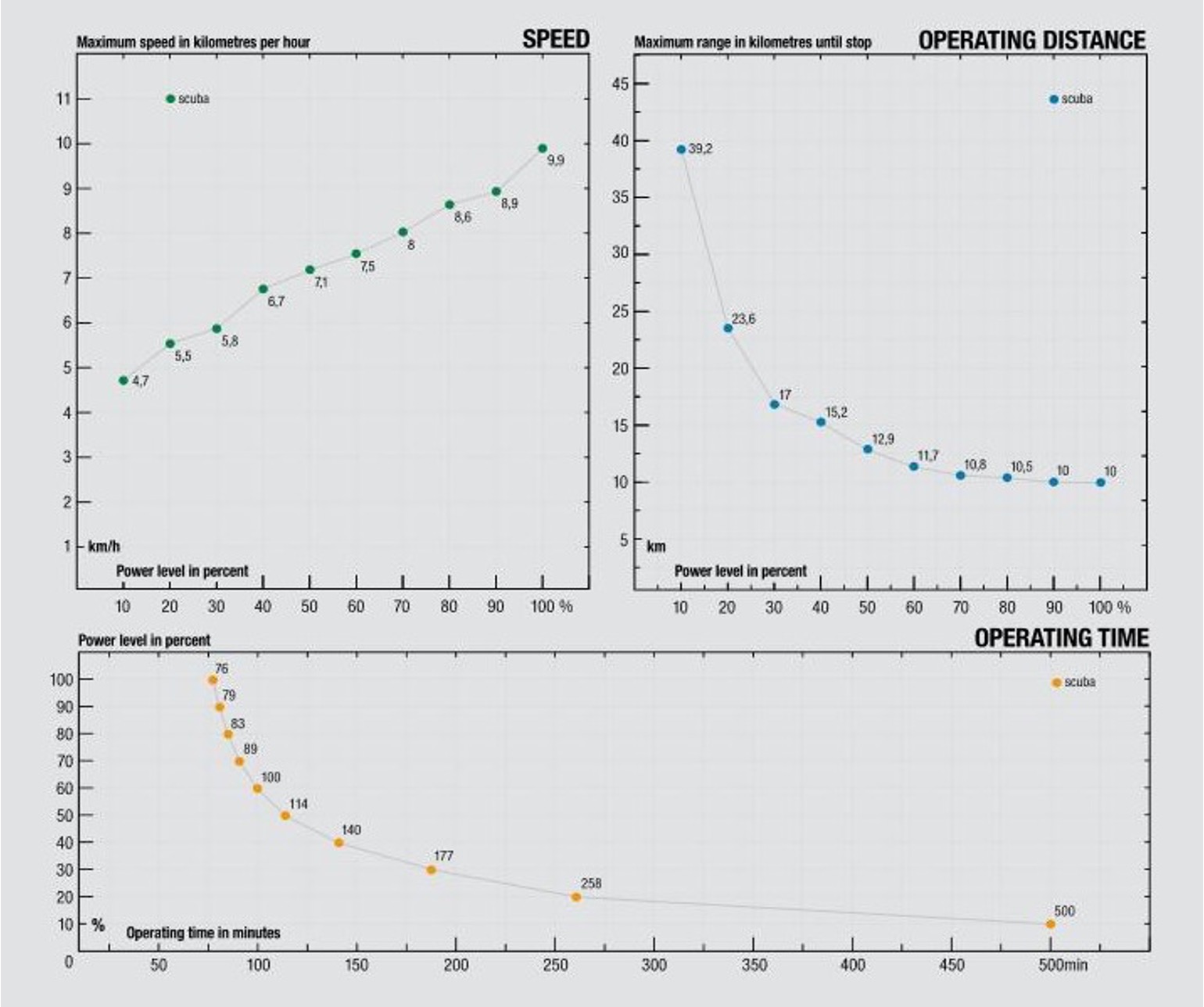Η ισχύς του κινητήρα φτάνει τους 8 ίππους (5,9 kW) και ρυθμίζεται σε 10 επίπεδα ανάλογα με το επιχειρησιακό σενάριο. Η ώση αγγίζει τα 735 Newton, παρέχοντας τη δυνατότητα μεταφοράς περισσότερων του ενός δυτών, είτε επάνω στο ίδιο το όχημα είτε μέσω συστημάτων ρυμούλκησης. Η μέγιστη ταχύτητα φτάνει τα 12,5 χιλιόμετρα/ώρα, ενώ η επιχειρησιακή εμβέλεια ξεπερνά τα 20 χιλιόμετρα, με δυνατότητα άνω των 30 σε συγκεκριμένα προφίλ χρήσης.