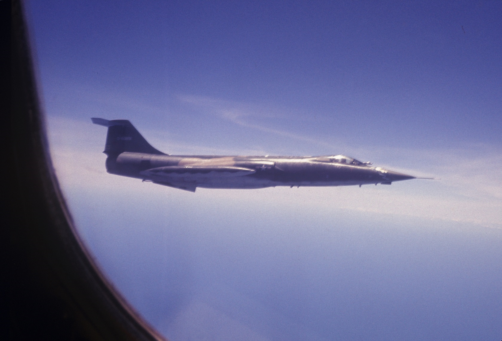 Air to air view of Lockheed F-104 Starfighter, likely over the Gulf of Tonkin, circa 1967.