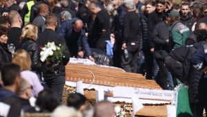 Σκηνές από μια τραγωδία που δε χωρά ο ανθρώπινος νους εκτυλίχθηκαν το μεσημέρι στο νεκροταφείο της πόλης Κότσανι, στη Βόρεια Μακεδονία · κραυγές απόγνωσης από μάνες που έχασαν τα παιδιά τους, πατεράδες που κρατούσαν το κεφάλι τους σαν να μην μπορεί να χωρέσει ο νους τους αυτό που έχει συμβεί, συγγενείς με μπλούζες που έφεραν πάνω τους τη μορφή των αγαπημένων τους προσώπων, νεαροί με λουλούδια στα χέρια και δάκρυα στα μάτια, και ένα ποτάμι ανθρώπων να παρακολουθεί βουβό. Το Κότσανι, από τα ξημερώματα της Κυριακής, που η φονική πυρκαγιά σε νυχτερινό κέντρο στέρησε τη ζωή σε 59 άτομα και οδήγησε δεκάδες άλλα στο νοσοκομείο με σοβαρά εγκαύματα, είναι σε πένθος. Ένα πένθος που κορυφώθηκε με τη σημερινή ταφή των θυμάτων. Πολλοί από τους συγγενείς δεν άντεξαν την πίεση και στην εικόνα των φέρετρων που κατέφθαναν επί αρκετή ώρα στον χώρο της ταφής, λύγισαν και χρειάστηκε είτε να τους παρασχεθούν οι πρώτες βοήθειες, είτε να διακομιστούν με ασθενοφόρα του Ερυθρού Σταυρού στο νοσοκομείο.