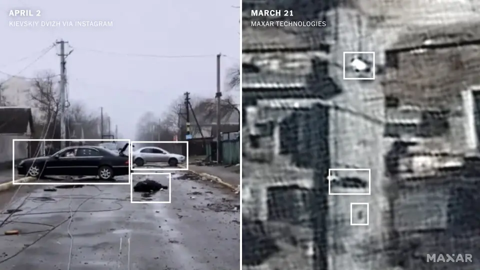 Οι δορυφορικές φωτογραφίες προέρχονται από τη Maxar Technologies και φανερώνουν πως πτώματα που διαπιστώθηκαν την 1η Απριλίου, ήταν δηλαδή έφθασαν Ουκρανικές δυνάμεις στην πόλη, ήταν στους ίδιους δρόμους και στα ίδια ακριβώς σημεία και πριν μέρες όπως φαίνεται στις φωτό. Κάτι που υποδεικνύει πως οι εκτελέσεις τους δεν μπορεί να είναι μεταγενέστερες και «ενορχηστρωμένες».