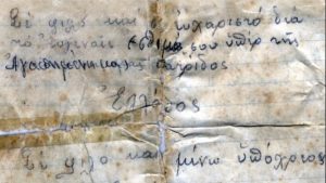 Η αποστολέας, έγραφε μεταξύ άλλων: «Αγαπητέ στρατιώτη. Φθάνουν Χρηστούγεννα. Όλλοι οι άνθρωποι μένουν στα σπίτια τους για να εορτάσουν….Εσείς οι ήρωές μας θα τα επεράσετε εις τα βουνά της Ηπείρου…Έχετε τη βοήθειαν του Θεού και νικάται τον αιμοβόρο εχθρό… Πρέπει να έχετε θάρρος και επιμονή… Θα νικήσετε όμως και έτσι θα γυρίσετε εις τα σπίτια σας νικηταί…».