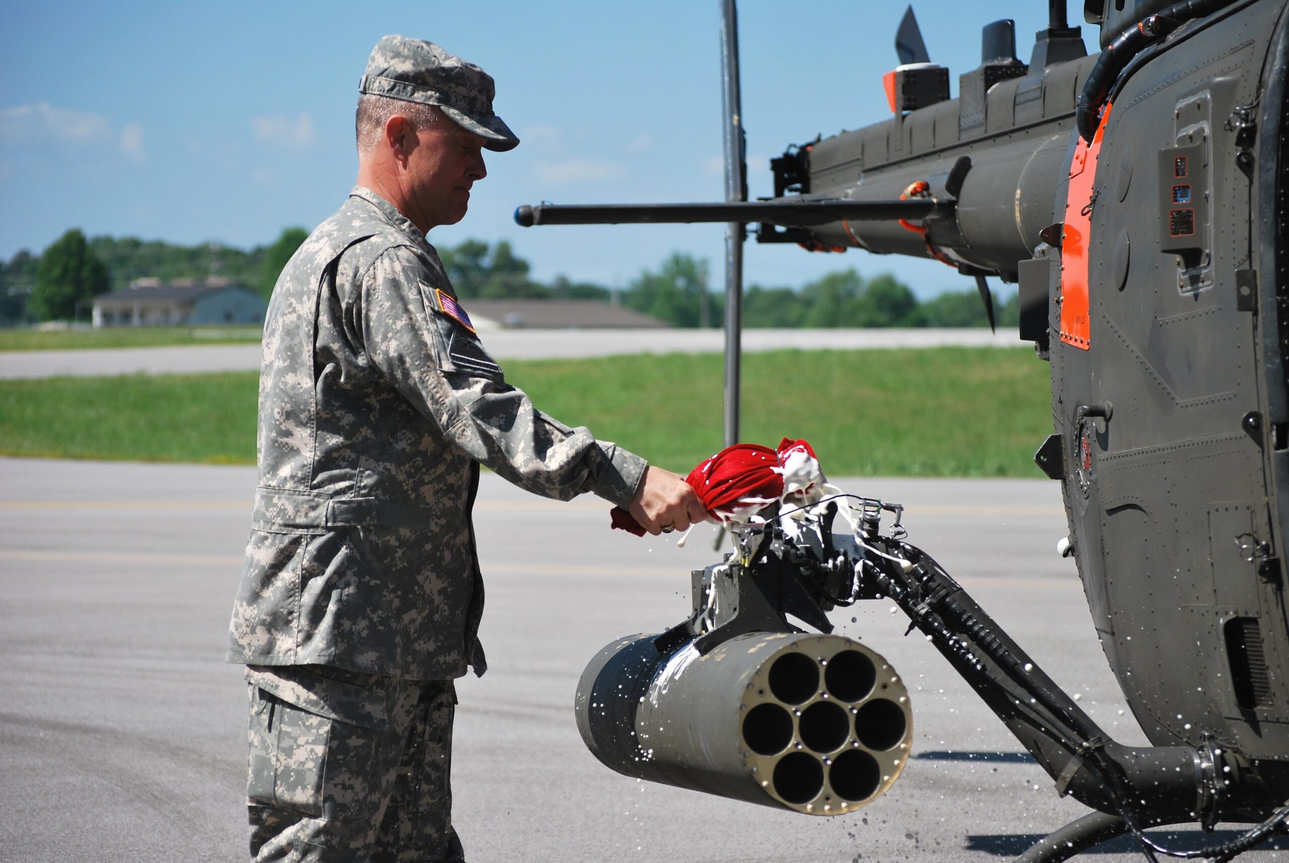 Maj. Gen. Kevin Mangum, Army Aviation Branch chief and commander of the U.S. Army Center of Excellence, Fort Rucker, Ala., christens the OH-58F Kiowa Warrior during a commemorative first flight ceremony April 30 on Redstone Arsenal, Ala. (Photo by Denise DeMonia)
