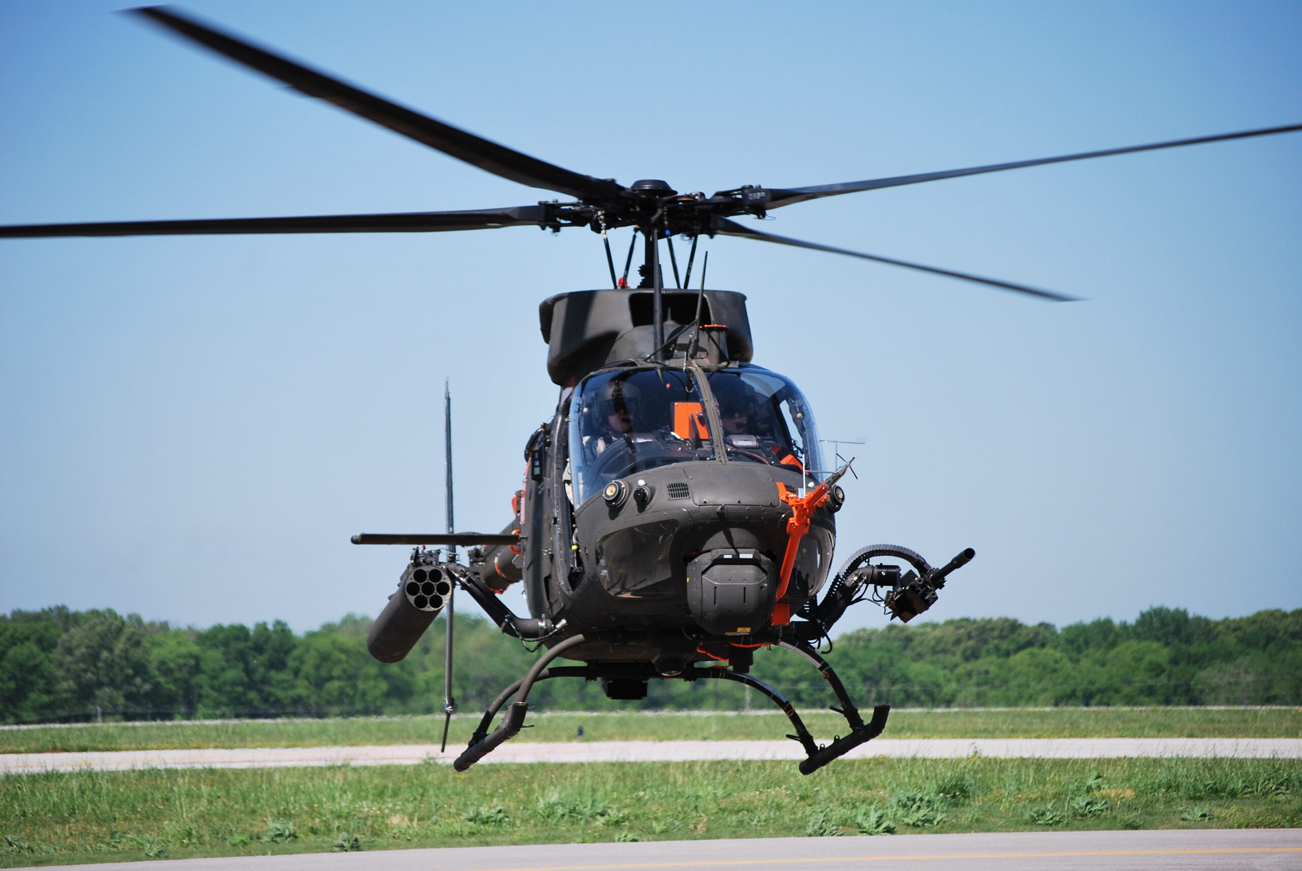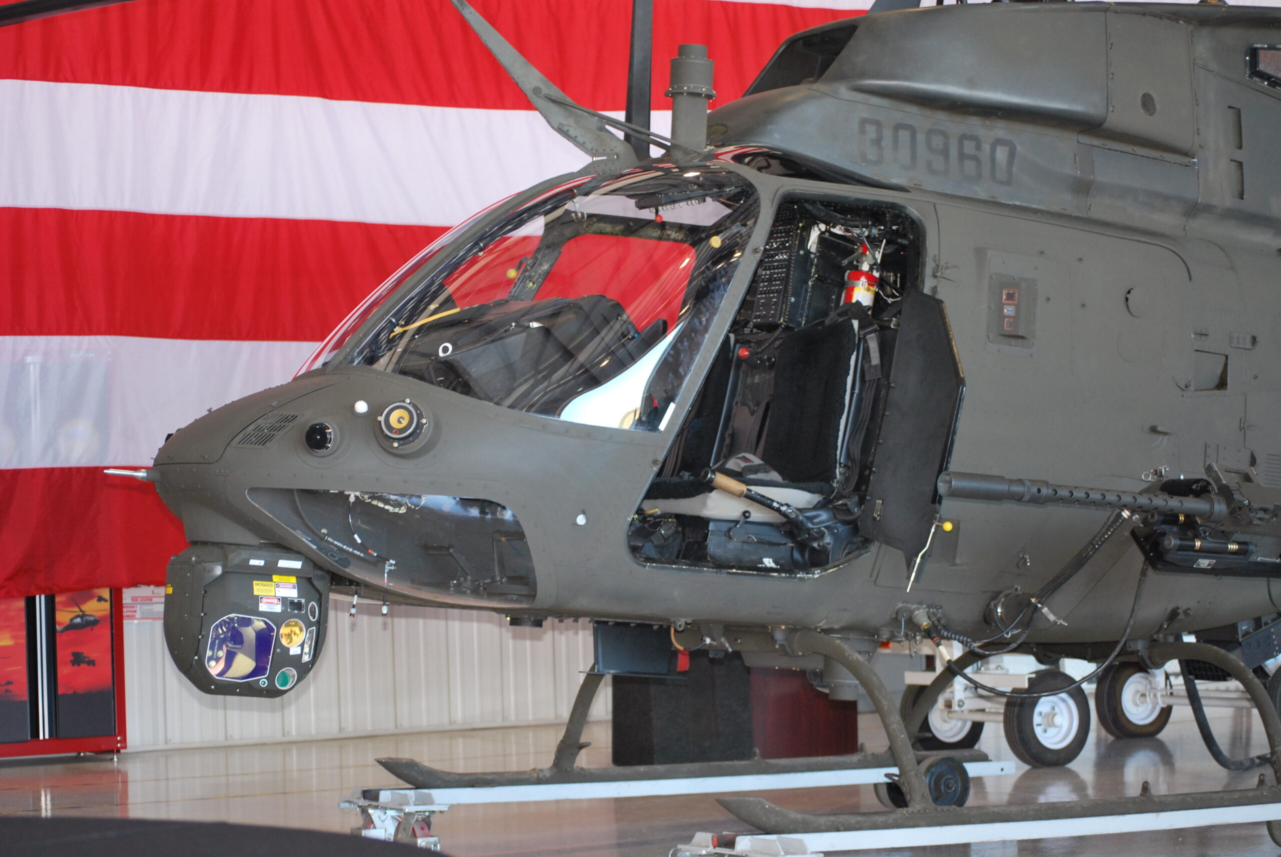 Most notable in the F-model Kiowa is the movement of the sensor from the mast to the nose of the aircraft. The F-model Kiowa Warrior capitalizes on non-developmental items and systems fielded on other aviation platforms to rapidly install, modify, or provide the following: advanced nose mounted sensor, improved cockpit control hardware and software for enhanced situational awareness, three full color multi-function displays, a dual-redundant digital engine controller for enhanced engine safety, digital inter-cockpit communications, digital Hellfire future upgrades, Aircraft Survivability Equipment upgrades, and a redesigned aircraft wiring harness. (Photo by Denise DeMonia)