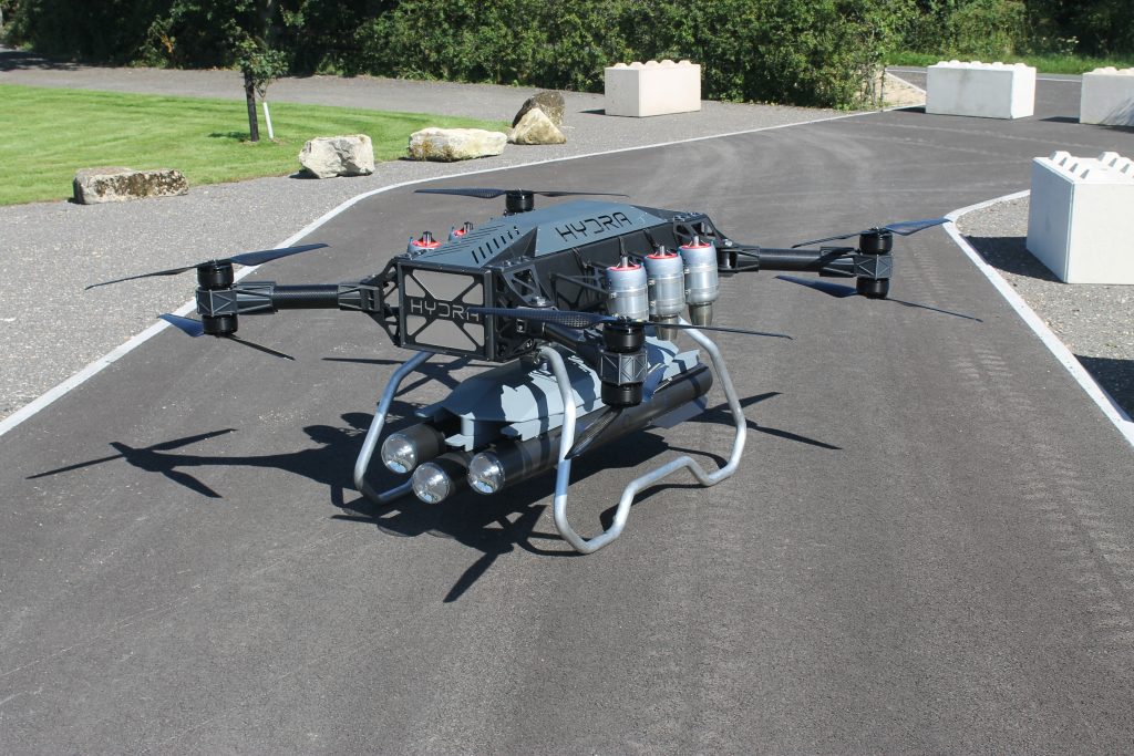 Ο φορέας τώρα, το οκτακόπτερο Hydra 400, της βρετανικής εταιρίας Hydra Drones κι αυτό έχει κάτι το ξεχωριστό καθώς τροφοδοτείται με μπαταρία, αλλά μπορεί να πάρει και 4 ή 6 μικροτζέτ κινητήρες, με καύσιμο κηροζίνη, για μεγαλύτερη απόδοση. Έτσι ως “υβριδικό”, δηλαδή με μπαταρίες και τους κινητήρες αυτούς, μπορεί να μεταφέρει έως 400 κιλά ωφέλιμο φορτίο, σε απόσταση έως 64 χιλιόμετρα (32 με επιστροφή)!