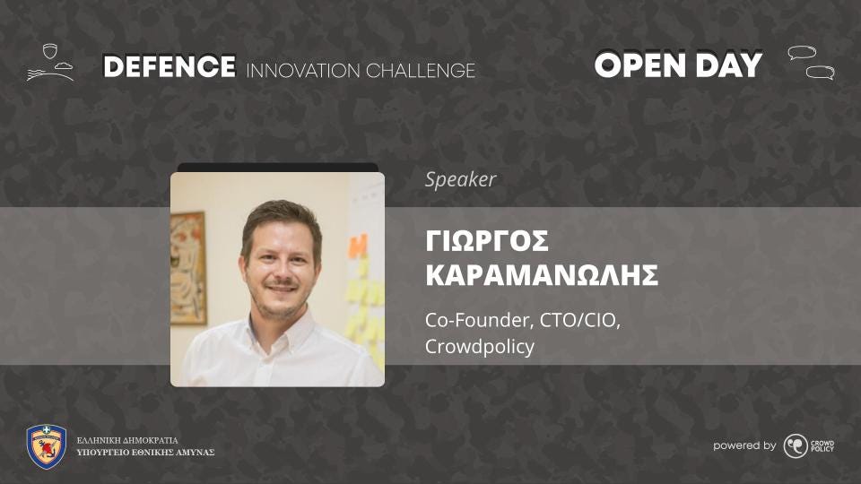 15:30–16:00 Παρουσίαση του Defence Innovation Challenge, διαδικασία bootcamp, στόχοι και θεματικές ενότητες, κ. Γιώργος Καραμανώλης, Co-Founder & CTO/CIO, Crowdpolicy