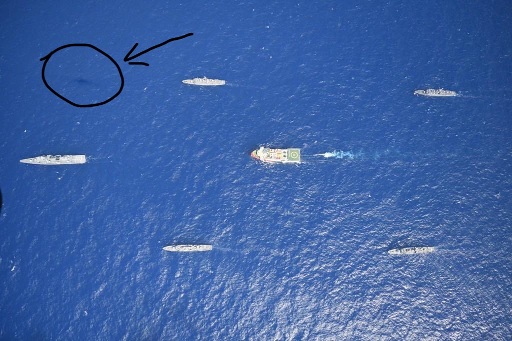 Μιλώντας για ASW, μας προκάλεσε έκπληξη μια σκιά στη δεύτερη φωτογραφία της “νηοπομπής”. Αν δεν ακολουθεί το ORUÇ REİS κάποια φάλαινα ή κάποιος φαλαινοκαρχαρίας (δεν υπάρχουν στη Μεσόγειο), και φυσικά δεν είναι παιχνίδι του φωτός, τότε μάλλον δίπλα (!) στο πλοίο και σε κατάδυση υπάρχει κάποιο υποβρύχιο! Θα χαρούμε να διαβάσουμε την άποψή σας επί του θέματος, μπορεί να κάνουμε και λάθος. Επίσης, αν κάποιος αναγνώστης μας μπορεί να διαβάσει τους αριθμούς στην πλώρη των πλοίων, παρακαλούμε να μας το γράψει στα σχόλια!