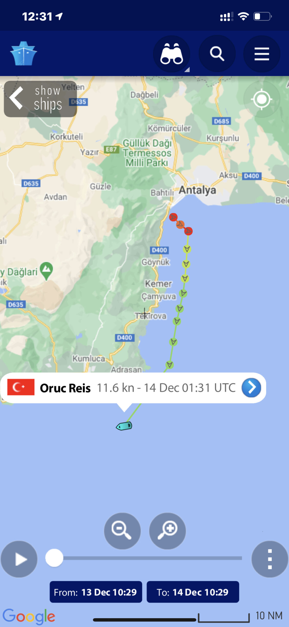 Από χτες το βράδυ, το τουρκικό ερευνητικό πλοίο Oruc Reis σήκωσε άγκυρα, και ξεκίνησε αργή πορεία προς δυσμάς. Κινείται αργά, με περίπου 10 κόμβους, και παράλληλα με την τουρκική ακτή. Πριν λίγο, το πλοίο φαίνεται να έχει κατεύθυνση προς Ρόδο και Καστελόριζο, αλλά αυτή θα ήταν και η πορεία του αν απλά μετακινείται προς κάποιο άλλο λιμάνι της Τουρκίας. Σε λίγες ώρες προφανώς θα ξέρουμε ποια είναι η νέα πορεία, και ποιος ο τελικός προορισμός. Λίγα μίλια πίσω του είναι και το Ataman, το ειδικό ρυμουλκό που συνήθως συνοδεύει το πλοίο. Και τα δυο πλοία εγκατέλειψαν την Antalya χτες βράδυ.