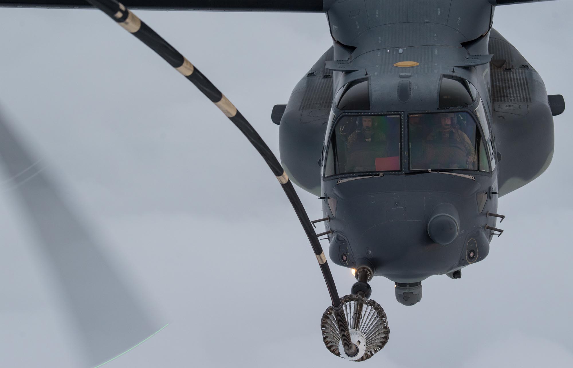 CV-22 Osprey της USAF από την 20η SOS, στην Cannon Air Force base του Νέου Μεξικού υλοποιεί εναέριο ανεφοδιασμό KC-10 Extender της 6ης ARS από την Travis AFB στην Καλιφόρνια στη διάρκεια εκπαίδευσης συνεργασίας. (Φωτογραφία U.S. Air Force Master Sgt. Joseph Swafford)
