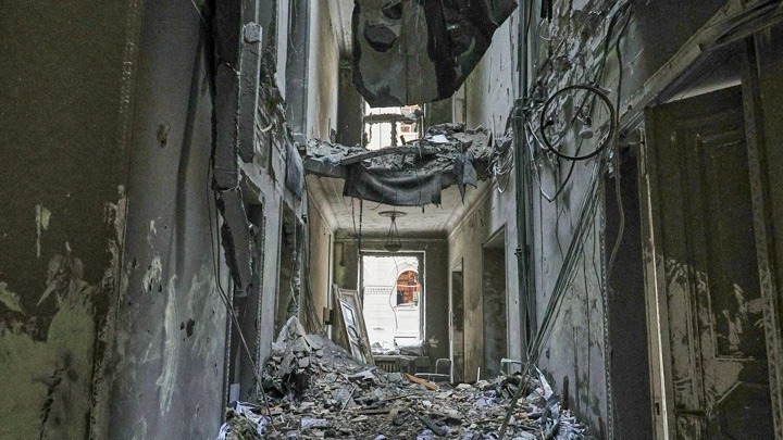 Τμήμα του κτιρίου έχει καταρρεύσει και διακρίνονται συντρίμμια και κομμάτια μπετόν σκορπισμένα στον δρόμο.