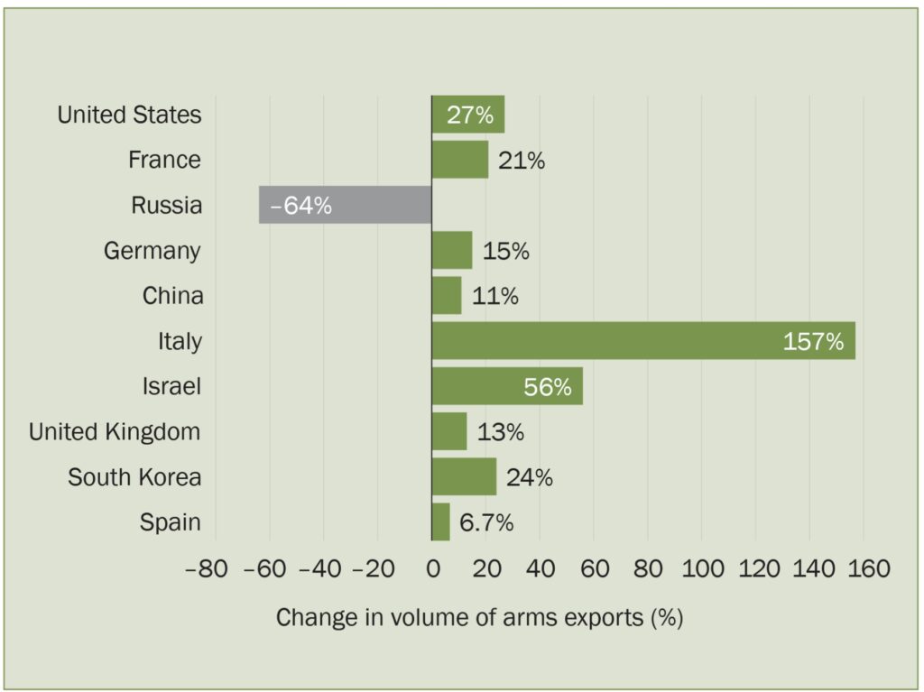 Οι ΗΠΑ παραμένουν ο μεγαλύτερος εξαγωγέας κύριων οπλικών συστημάτων, ενώ στη δεύτερη θέση βρίσκεται η Γαλλία και στην τρίτη η Ρωσία. Ακολουθούν η Γερμανία και η Κίνα, στην έκτη θέση βρίσκεται η Ιταλία, στην έβδομη το Ισραήλ και στην όγδοη η Βρετανία. Τη δεκάδα συμπληρώνουν η Νότια Κορέα και η Ισπανία.