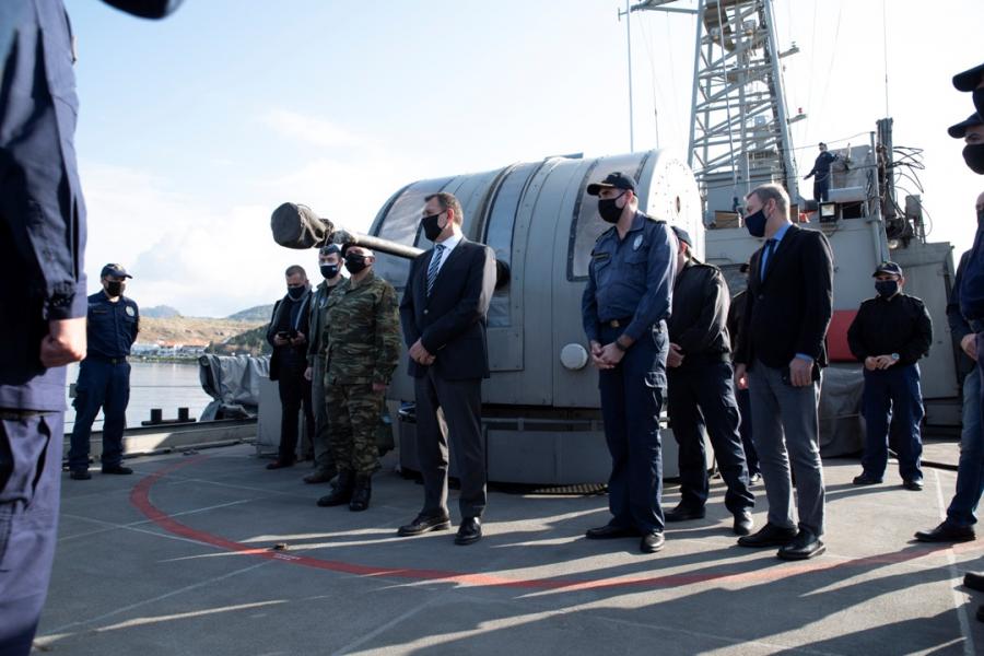 Στη συνέχεια ο κ. Παναγιωτόπουλος μετέβη στον Ναυτικό Σταθμό Λήμνου (ΝΑΣ.ΛΗ), όπου δέχθηκε ευχές από τα παιδιά του Κέντρου Ειδικής Φροντίδος Παίδων (ΚΕΦΠ) μέσω τηλεδιασκέψεως και συνομίλησε με το προσωπικό. Αργότερα, ο ίδιος πήγε στην Κανονιοφόρο του Πολεμικού Ναυτικού (Κ/Φ “ΝΑΥΜΑΧΟΣ”) που εκτελεί χρέη πλοίου «φυλακής σκοπούντος» στο Βόρειο Αιγαίο, όπου αντήλλαξε ευχές με το πλήρωμα.