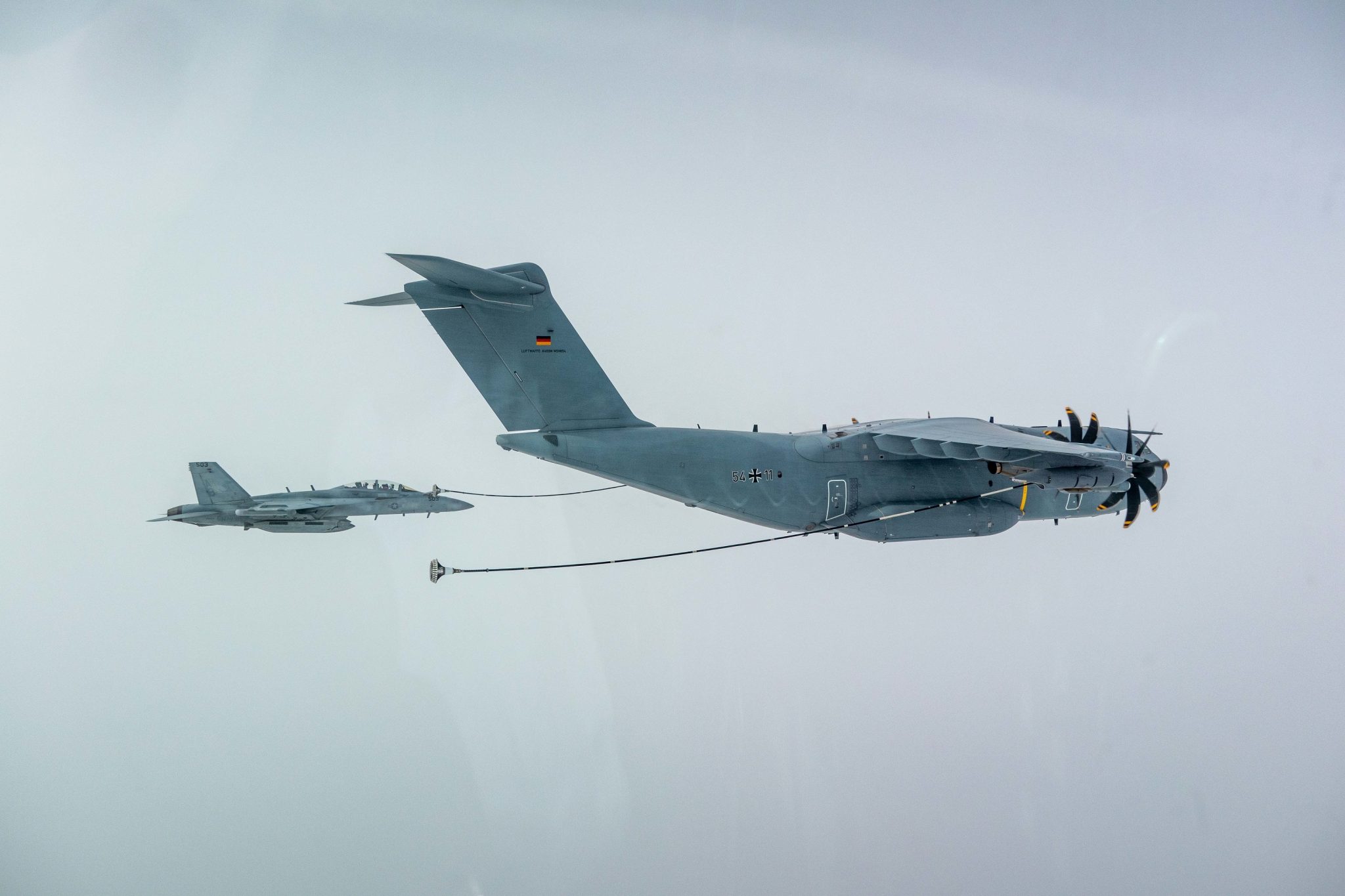 Γερμανικό A400M ανεφοδιάζει κάπου πάνω από το Αιγαίο EA-18G της VAQ-137 «Rooks», που επιχειρεί από το USS Harry S. Truman. Το Growler, όπως και άλλα αεροσκάφη του είδους περιπολούν στην ευρύτερη περιοχή της κρίσης στην Ουκρανία δημιουργώντας χάρτες ηλεκτρονικών απειλών, πληροφορίες που καταλήγουν στους ουκρανική πλευρά για τις θέσεις και τις κινήσεις των ρωσικών δυνάμεων εισβολείς.