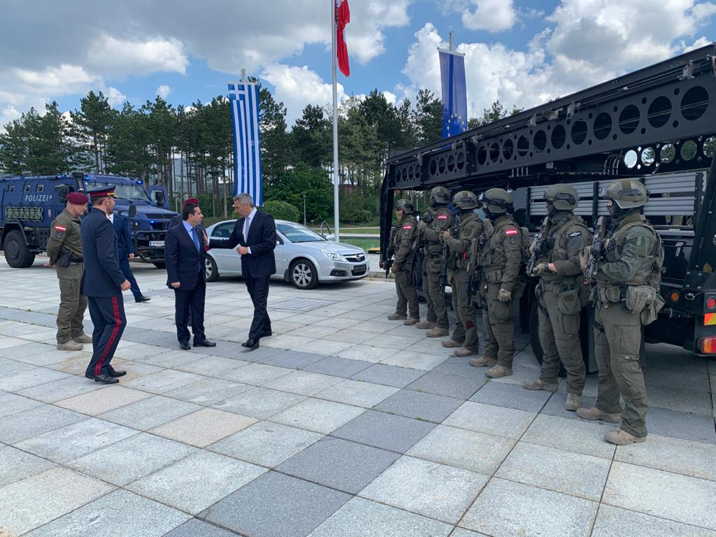 Κατά την τελετή που διοργανώθηκε στο Κέντρο των Ειδικών Δυνάμεων της Αυστριακής Αστυνομίας, ο κ. Μηταράκης απένειμε στον επικεφαλής της αυστριακής ομάδας Αστυνόμο Johann Rieger, ανώτερη διάκριση της ελληνικής Πολιτείας, εξ’ ονόματος της Προέδρου της Δημοκρατίας κας Κ. Σακελλαροπούλου.