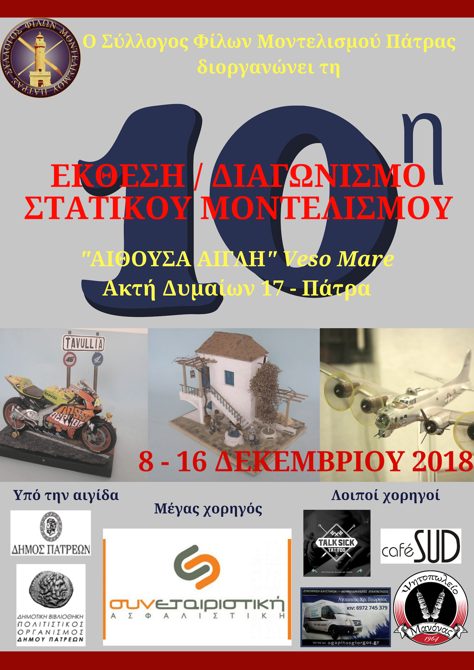 Ο Σύλλογος Φίλων Μοντελισμού Πάτρας πραγματοποιεί την 10η Ετήσια Έκθεση – Διαγωνισμό Στατικού Μοντελισμού, από το Σάββατο 08 έως την Κυριακή 16 Δεκεμβρίου 2018 στον Πολυχώρο της «Veso Mare» αίθουσα εκδηλώσεων «Αίγλη» υπό την αιγίδα της Δημοτικής Βιβλιοθήκης Πολιτιστικού Οργανισμού του Δήμου Πατρέων.