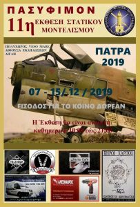 Ο Σύλλογος Φίλων Μοντελισμού Πάτρας πραγματοποιεί την 11η Ετήσια Έκθεση-Διαγωνισμό Στατικού Μοντελισμού, από το Σάββατο 07 έως την Κυριακή 15 Δεκεμβρίου 2019 στον Πολυχώρο της «Veso Mare» αίθουσα εκδηλώσεων «Αίγλη».