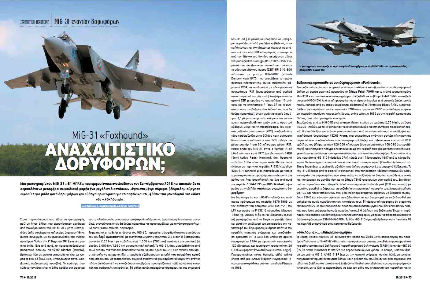 Μια φωτογραφία του ενός MiG-31 που εμφανίστηκε στο Διαδίκτυο τον Σεπτέμβριο του 2018 και απεικόνιζε το αεροπλάνο να μεταφέρει σε κοιλιακό φορέα ένα μεγάλων διαστάσεων -άγνωστο μέχρι σήμερα- βλήμα δημιούργησε εικασίες για ρόλο κατά δορυφόρων και εύλογα ερωτήματα για το παρόν και το μέλλον του μοναδικού στο είδος του «Foxhound».