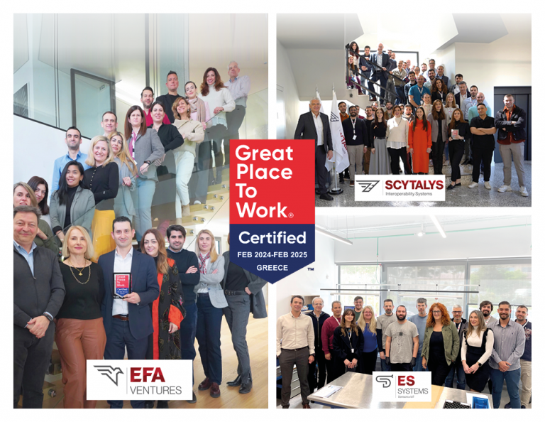 Οι εταιρίες του EFA GROUP, EFA VENTURES, SCYTALYS και ES SYSTEMS, που δραστηριοποιούνται στον τομέα της Αεροδιαστημικής, Ασφάλειας, Άμυνας και Βιομηχανικών Συνεργασιών, ανακοινώνουν ότι απέκτησαν, για 2η συνεχόμενη χρονιά, την Πιστοποίηση Great Place to Work, μετά από αξιολόγηση που διενήργησε ο οργανισμός Great Place to Work Hellas.