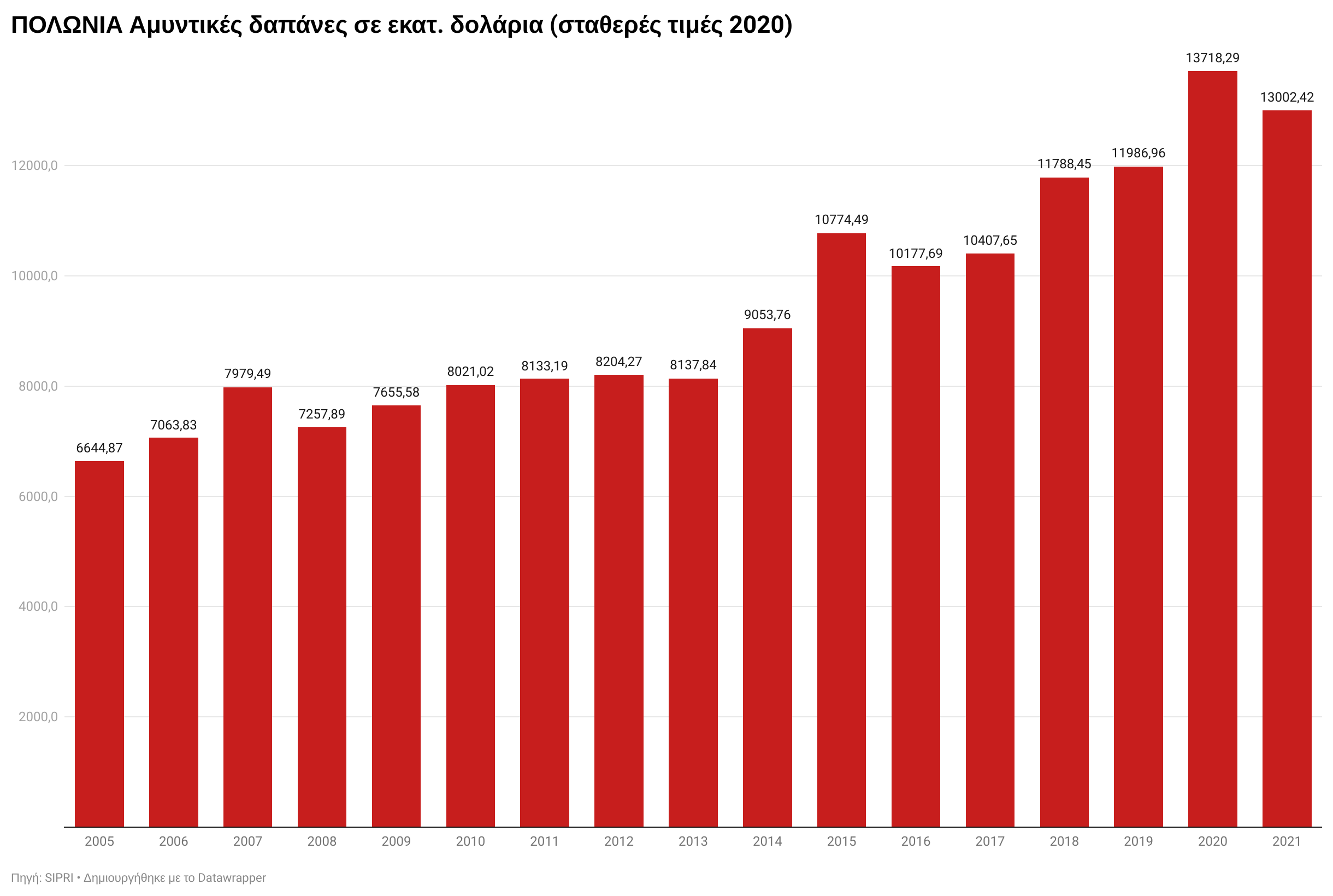 Το οικονομικό ζήτημα δεν είναι απλό επίσης. Την τελευταία δεκαετία η Πολωνία κατάφερνε να έχει αμυντικές δαπάνες κάπου στο 2% του ΑΕΠ της, τώρα πάει ολοταχώς για το 3% και ίσως φθάσει το 5% σε 2-3 χρόνια όταν ξεκινήσουν οι μαζικές αποπληρωμές όλων αυτών των συστημάτων που έχει παραγγείλει. Πάντως λόγω αυξανόμενου ΑΕΠ η επένδυση σε άμυνα συνεχώς αυξάνεται όπως φαίνεται στο διάγραμμα.