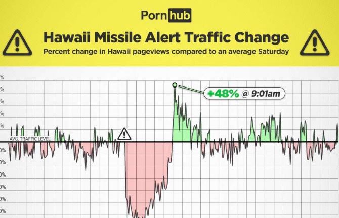 Στις 8:07 πμ, της 13/1/18, ημέρα Σάββατο, όλοι οι κάτοικοι της Χαβάης έλαβαν μήνυμα στο κινητό τους για επερχόμενο βαλλιστικό πύραυλο. Η επισκεψιμότητα του Pornhub, σημείωσε πτώση της τάξεως του 77%. Αυτό φυσικά είναι αναμενόμενο, αλλά από την άλλη, υπήρξαν πολλοί που είτε δεν ενημερώθηκαν για το συναγερμό, ή απλά αδιαφόρησαν, συνεχίζοντας να παρακολουθούν πορνό.