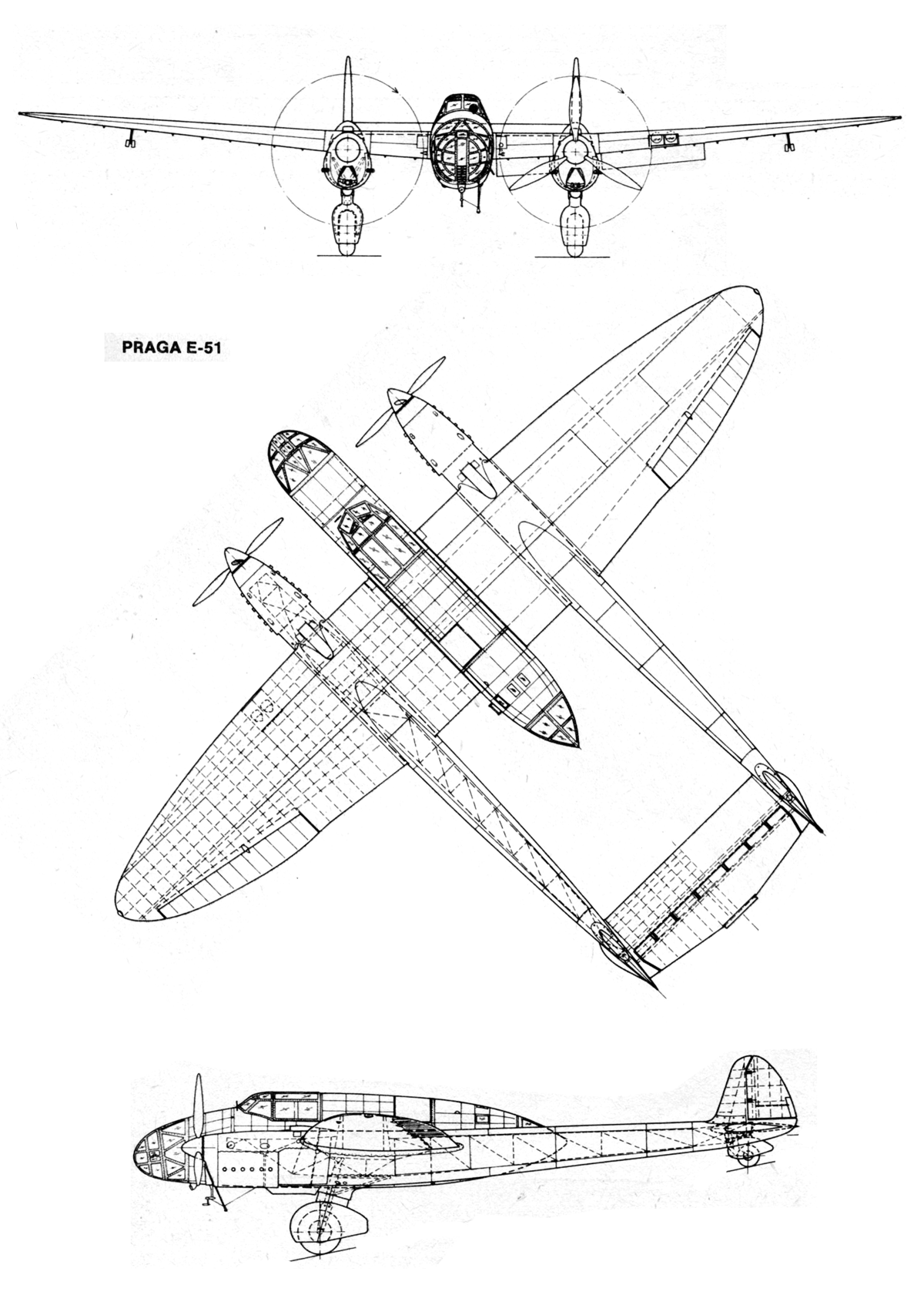 To δικινητήριο E-51 ήταν δημιούργημα της ČKD-Praga που ιδρύθηκε το 1930. O επικεφαλής σχεδιαστής της ανερχόμενης εταιρείας, Jaroslav Šlechta, άρχισε από το 1936 να εκδηλώνει το ενδιαφέρον του για αεροσκάφη με διπλό ουραίο και αυτό φάνηκε σε άλλα δύο projects του, το βομβαρδιστικό E-48 και το ελαφρύ μαχητικό E-52.