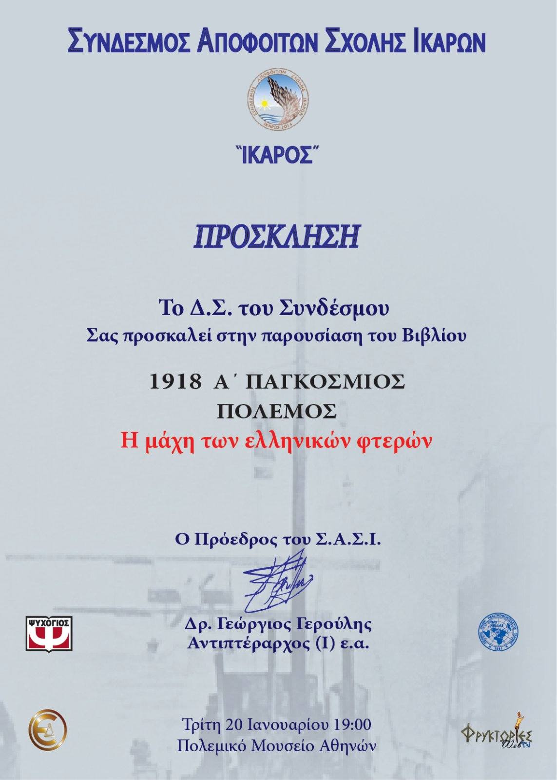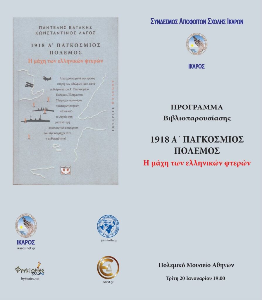 Την Τρίτη 20 Ιανουαρίου 2026, στις 19:00, στο Αμφιθέατρο του Πολεμικού Μουσείου Αθηνών, ο Σύνδεσμος Αποφοίτων Σχολής Ικάρων «ΙΚΑΡΟΣ» διοργανώνει την επίσημη παρουσίαση του νέου ιστορικού έργου με τίτλο «1918 Α’ Παγκόσμιος Πόλεμος – Η μάχη των ελληνικών φτερών», των συγγραφέων Παντελή Βατάκη (Ταξίαρχος Ιπταμένων ε.α., ιστορικός ερευνητής) και Κωνσταντίνου Λαγού (Δρ Ιστορίας, Λέκτορας Αεροπορικής Ιστορίας στη Σχολή Ικάρων).