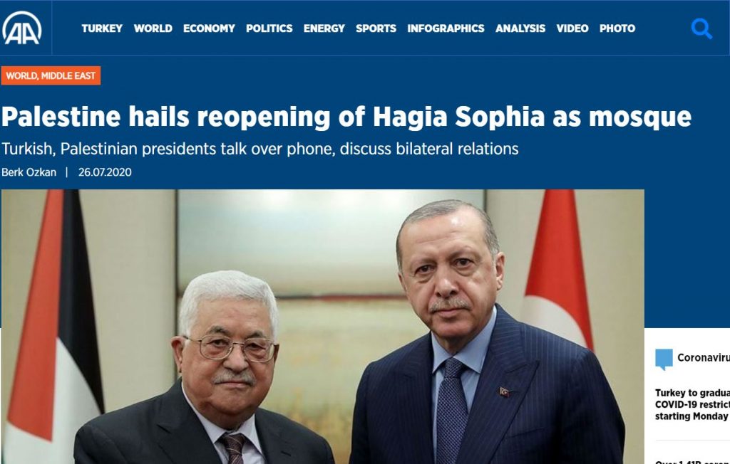 Δεν πρέπει να ξεχνάμε ωστόσο πως πέρυσι, σε συνομιλία του με τον Ρετζέπ Ταγίπ Ερντογάν, ο Παλαιστίνιος πρόεδρος Μαχμούντ Αμπάς χαιρέτισε την απόφαση της Τουρκίας να μετατρέψει την Αγία Σοφία σε τζαμί.