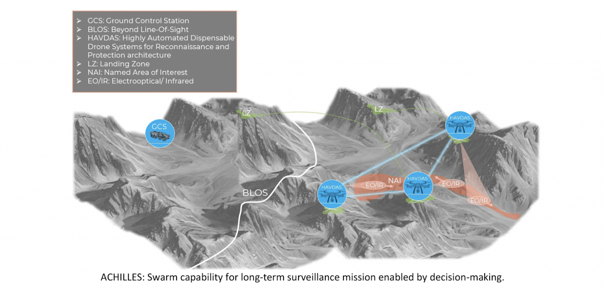 - Να αναπτύξει και να αποδείξει τη σκοπιμότητα των αυτόνομων, αναδιαμορφώσιμων σμηνών drones, που προορίζονται για διαρκή παρακολούθηση, εισάγοντας την αρχιτεκτονική HAVDAS (Highly Automated Dispensable Drone Systems for Reconnaissance and Protection).