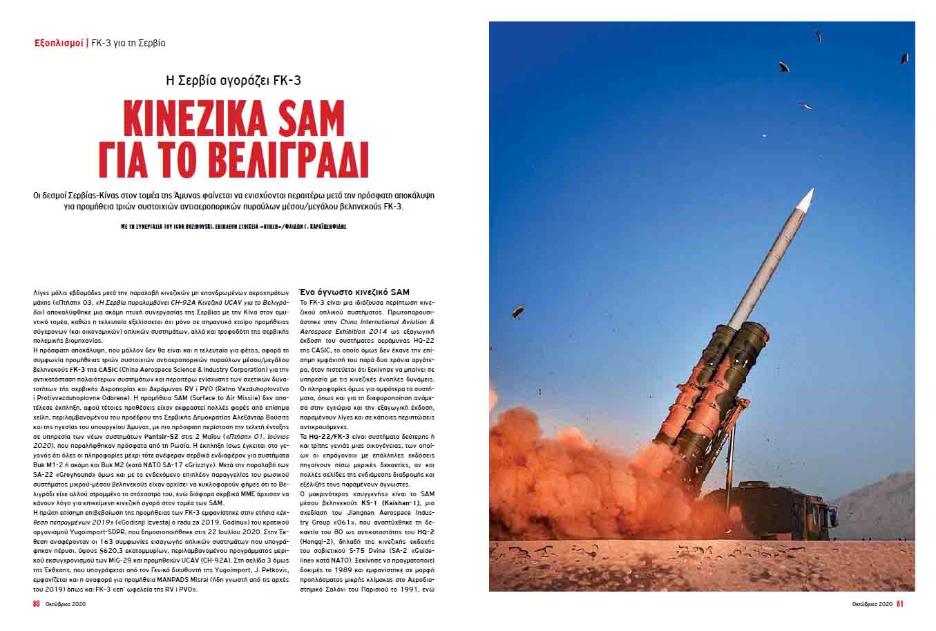 Οι δεσμοί Σερβίας-Κίνας στον τομέα της Άμυνας φαίνεται να ενισχύονται περαιτέρω μετά την πρόσφατη αποκάλυψη για προμήθεια τριών συστοιχιών αντιαεροπορικών πυραύλων μέσου/μεγάλου βεληνεκούς FK-3.