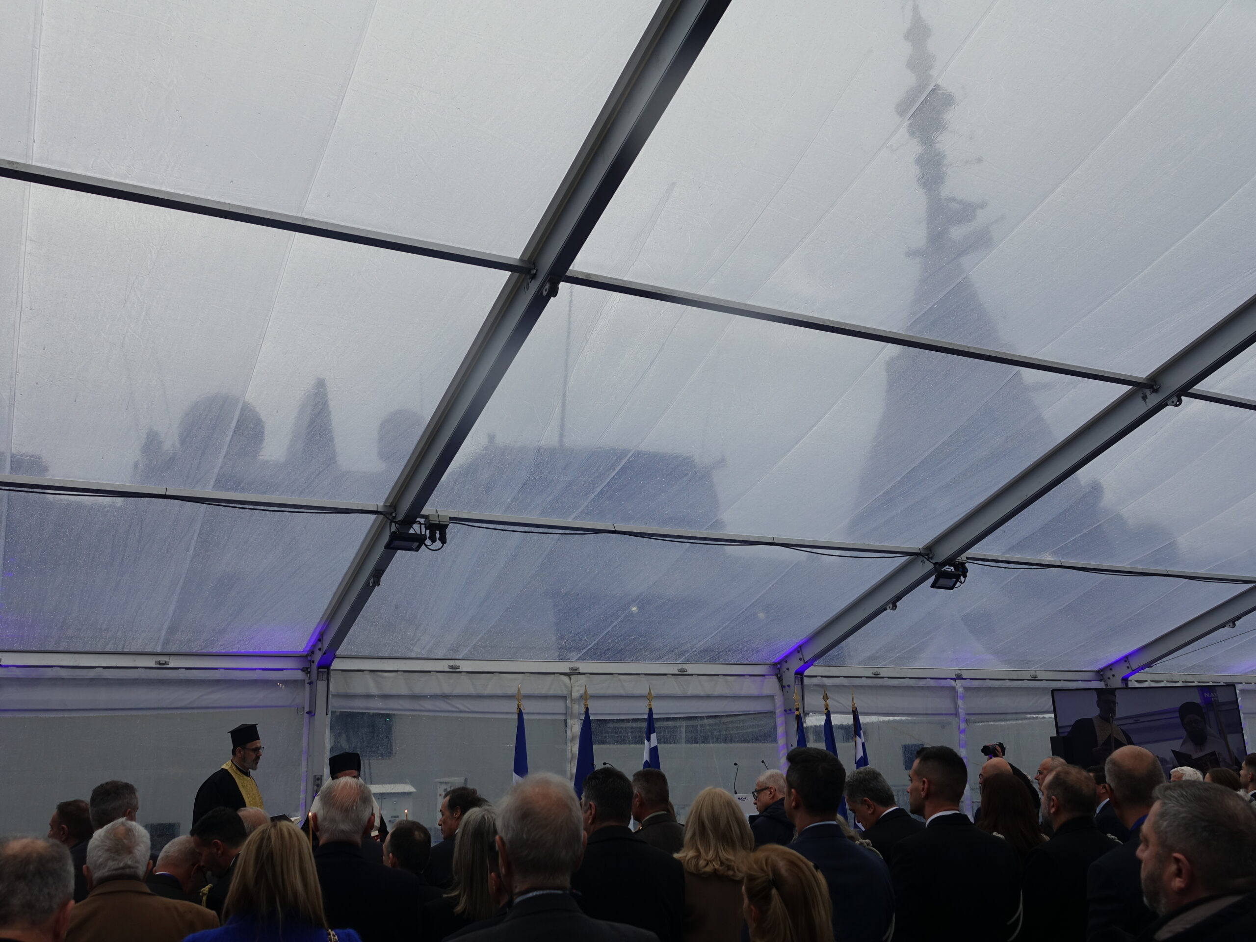 Οι αντίξοες καιρικές συνθήκες που επικρατούσαν τη συγκεκριμένη ημέρα δεν στάθηκαν ικανές να εμποδίσουν στο ελάχιστο την διεξαγωγή της συγκινητικής τελετής. Εκεί ήταν εκπρόσωποι της πολιτικής και της στρατιωτικής ηγεσίας, εμπορικοί εταίροι, το πλήρωμα του πλοίου και αρκετοί που συνέβαλαν στην ολοκλήρωση του εγχειρήματος.