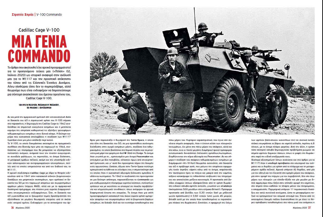 To άρθρο είχε αρχικά προγραμματιστεί για το προηγούμενο τεύχος μας («Πτήση» 02, Ιούλιος 2020) ως ιστορική αναφορά στην ανάλυσή μας για το M1117 και την προοπτική απόκτησης του τύπου από τις Ελληνικές Ένοπλες Δυνάμεις. Λόγω πληθώρας ύλης δεν το συμπεριλάβαμε, αλλά θεωρούμε πως είναι ενδιαφέρον να δημοσιεύσουμε μια σύντομη ανασκόπηση του άμεσου προγόνου του, Cadillac Cage V-100.
