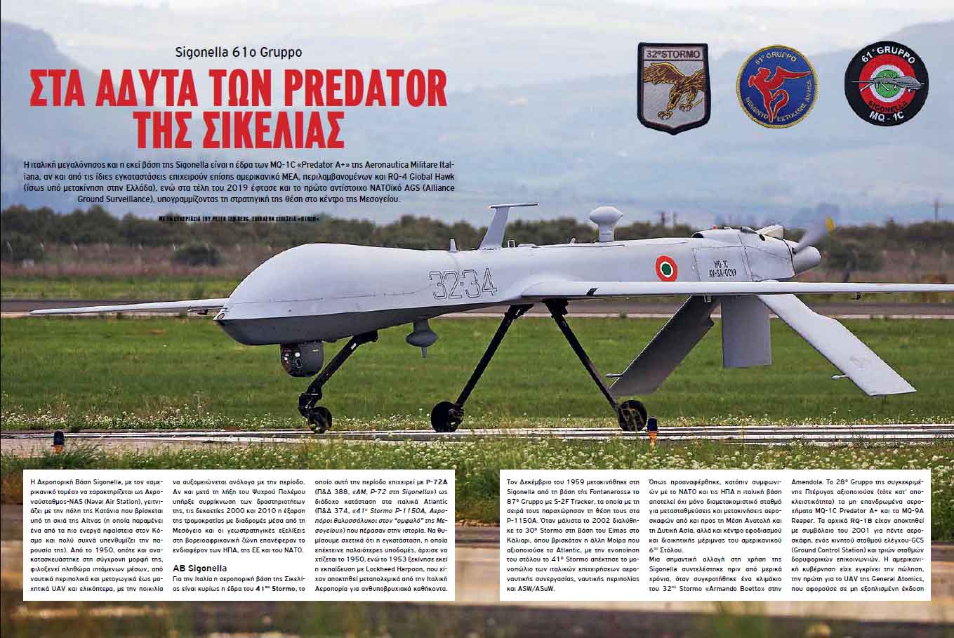 Η ιταλική μεγαλόνησος και η εκεί βάση της Sigonella είναι η έδρα των MQ-1C «Predator A+» της Aeronautica Militare Italiana, αν και από τις ίδιες εγκαταστάσεις επιχειρούν επίσης αμερικανικά ΜΕΑ, περιλαμβανομένων και RQ-4 Global Hawk (ίσως υπό μετακίνηση στην Ελλάδα), ενώ στα τέλη του 2019 έφτασε και το πρώτο αντίστοιχο ΝΑΤΟϊκό AGS (Alliance Ground Surveillance), υπογραμμίζοντας τη στρατηγική της θέση στο κέντρο της Μεσογείου. Βρεθήκαμε στα άδυτά της και τις Επιχειρήσεις Sophia και Irini.