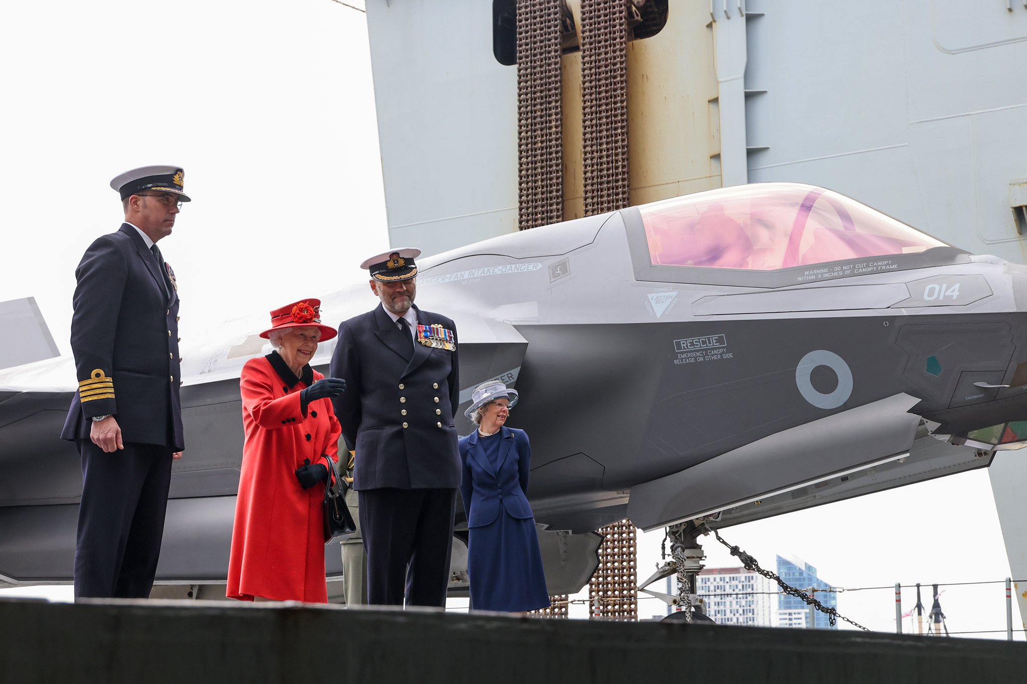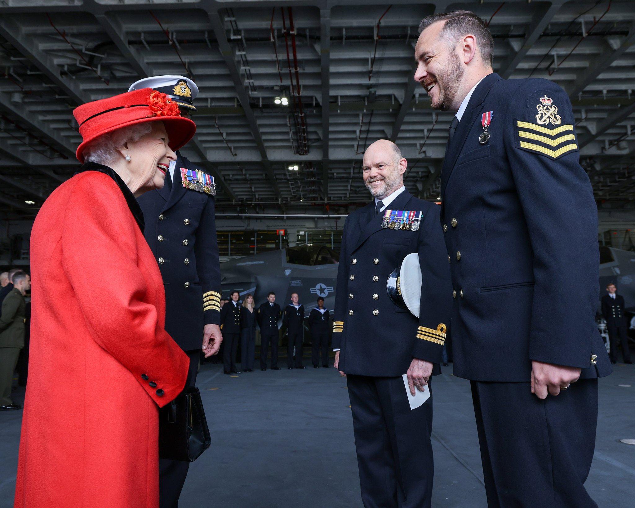 Πίσω στο αεροπλανοφόρο τώρα, η 95χρονη μονάρχης – που ήταν και η “νονά” του στην καθέλκυση του- ήταν σε καλή διάθεση, ξεναγήθηκε στο σκάφος, μίλησε με το πλήρωμα, ενώ ανέβηκε στο κατάστρωμα πτήσης κάνοντας χρήση του ανελκυστήρα αεροσκαφών.