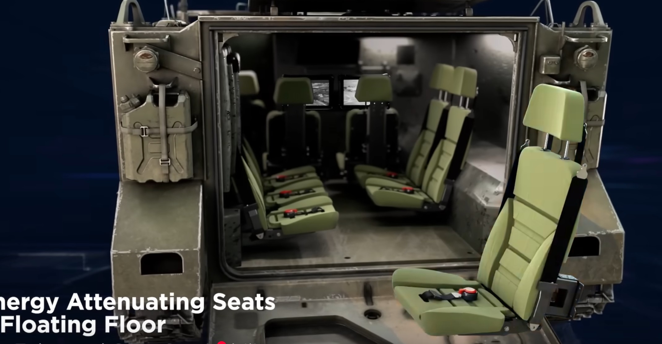Μια σημαντική αδυναμία που γίνεται εμφανής από το βίντεο αφορά την διάταξη των θέσεων για τους μεταφερόμενους οπλίτες και το πλήρωμα. Οι εικόνες δείχνουν καθίσματα βιδωμένα απευθείας στα πλαινά/πάτωμα του οχήματος, μια επιλογή που διατηρεί την απλότητα του αρχικού σχεδιασμού, αλλά υστερεί σοβαρά σε προστασία. Μελέτες από τον αμερικανικό Στρατό, βασισμένες σε εμπειρίες από το Ιράκ και το Αφγανιστάν, δείχνουν ότι οι διατάξεις με μη αναρτημένα καθίσματα, αυξάνουν τη θνησιμότητα κατά 40-50% σε ναρκοπέδια, ιδιαίτερα όταν συνδυάζονται με περιορισμένη θωράκιση στο κάτω μέρος του οχήματος. Σε σύγχρονα τεθωρακισμένα μάχης οι θέσεις πλέον είναι αναρτημένες από την οροφή και διαθέτουν συστήματα απόσβεσης κραδασμών, οπότε έτσι καλύπτουν σημαντικά το προσωπικό από νάρκες ή αυτοσχέδια εκρηκτικά.
