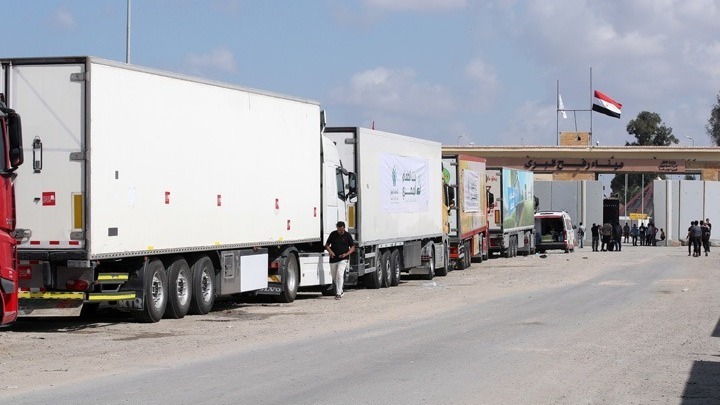 Η κρατική τηλεόραση της Αιγύπτου έδειξε εικόνες από πολλά φορτηγά να περνούν το συνοριακό πέρασμα, κατά την 15η ημέρα του πολέμου μεταξύ του Ισραήλ και της Χαμάς και μετά την επιβολή πλήρους πολιορκίας στη Γάζα από το Ισραήλ εξαιτίας της οποίας οι 2,4 εκατομμύρια κάτοικοι του θύλακα – οι μισοί από τους οποίους παιδιά και έφηβοι- βρίσκονται χωρίς νερό, ηλεκτρικό ρεύμα και καύσιμα.