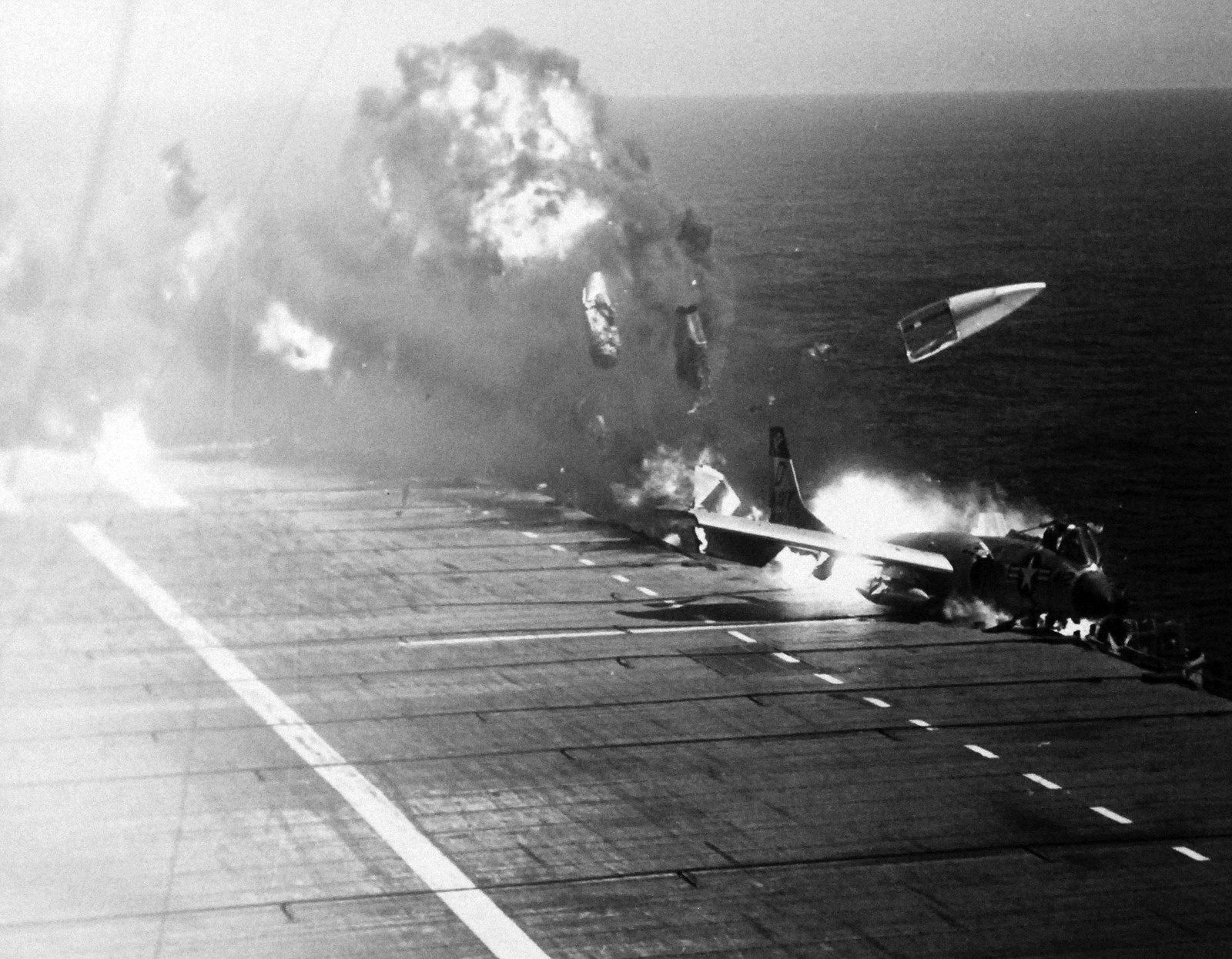 Το «412» χτύπησε στην άκρη του καταστρώματος και έγινε μια πύρινη σφαίρα που σκόρπιζε φλεγόμενα κομμάτια και καύσιμο. Δύο ναύτες και ένας φωτογράφος κάηκαν ζωντανοί στην κόλαση φωτιάς που εξαπλώθηκε σε δευτερόλεπτα. Σαν από θαύμα, επτά άνθρωποι στον διάδρομο δίπλα στο κατάστρωμα πτήσεων γλύτωσαν με ελαφρά τραύματα.