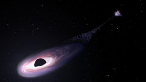 Φωτο: Η εντύπωση ενός καλλιτέχνη για μια υπερμεγέθη μαύρη τρύπα- δραπέτη, η οποία εκτοξεύεται από τον γαλαξία που τη φιλοξενούσε ως αποτέλεσμα διαμάχης μεταξύ αυτής και δύο άλλων μαύρων τρυπών. Credit: NASA, ESA, Leah Hustak (STScI)
