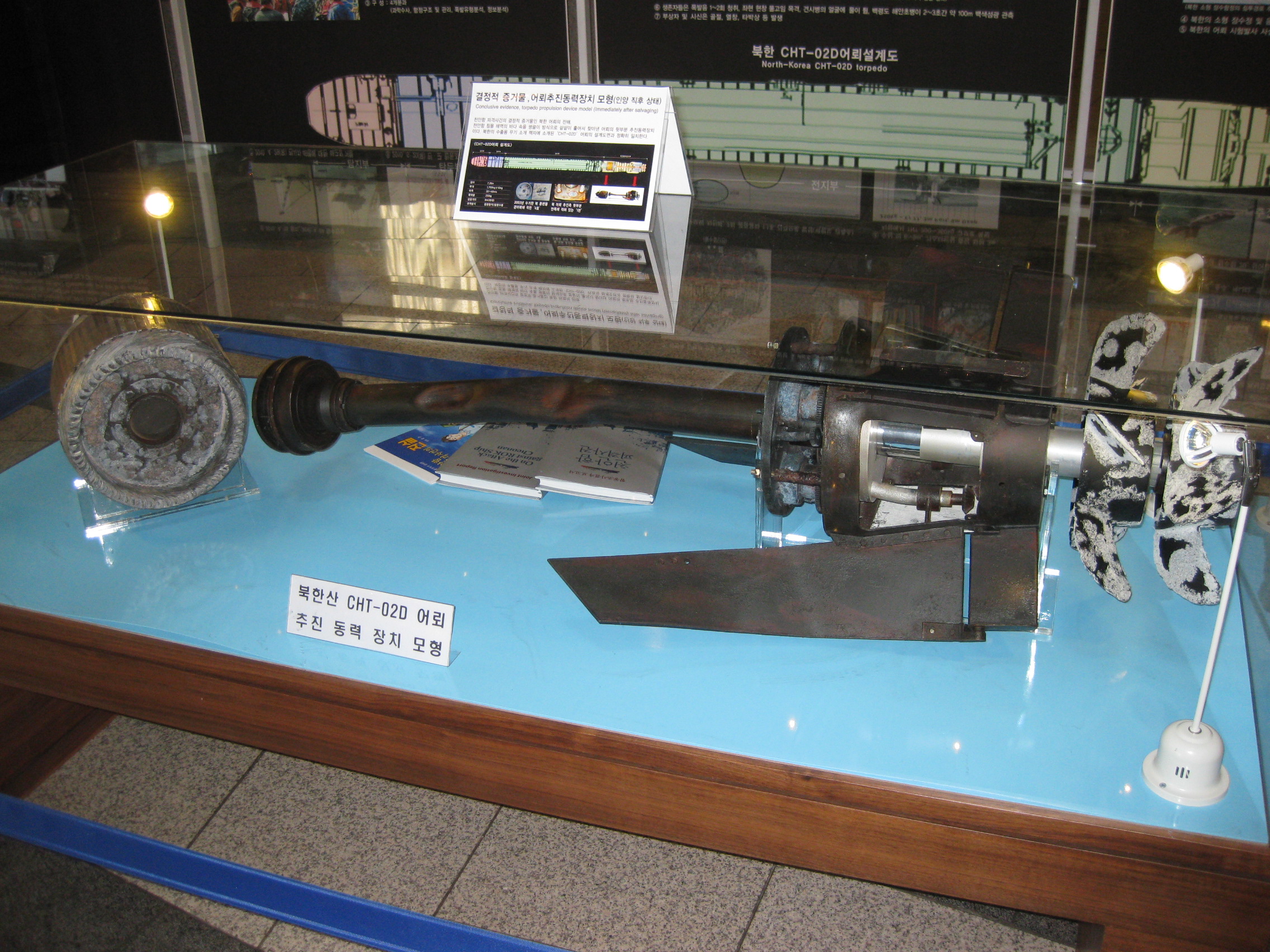 Μέρος της τορπίλης που φέρεται να εξαπολύθηκε από μίνι υποβρύχιο της Βόρειας Κορέας. Η ανεύρεση του τμήματος έγινε κατά τη διάρκεια των ερευνών που διεξήγαγε η Νότια Κορέα σε συνεργαασία με τις Η.Π.Α. Καναδά, Μεγάλη Βρετανία, Σουηδία και Αυστραλία.